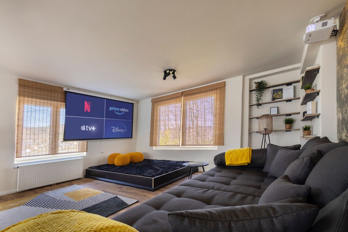 Disfruta de Colonia al más alto nivel en nuestra suite de cine. Bienvenido a este lujoso apartamento dúplex de 118 m² que ofrece todo lo necesario para disfrutar de una estancia fantástica en Colonia: → CAMA CON SOMIER (tamaño king) plaza de aparcamiento→ gratuita Cine en casa de→ 100 pulgadas y máquina de palomitas de maíz. → Cocina y máquina totalmente automática. Rincón de→ lectura. → A poca distancia a pie de todo lo que tu corazón desee. Conexión → perfecta en coche o transporte público. ☆«Realmente te sientes como en casa. ¡Reservaríamos con Svyvo una y otra vez!"
