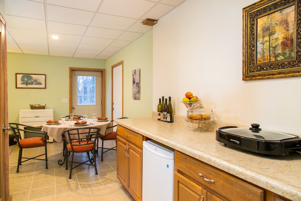 El apartamento privado del sótano Triple B tiene su propio acceso con más de 1000 pies cuadrados de espacio habitable que incluye un dormitorio privado, baño con ducha a ras de suelo y bañera separada. La cocina está totalmente equipada para que nuestros huéspedes disfruten de las comidas que preparan. Tenemos disponible una parrilla al aire libre, con asientos para comer tus comidas preparadas y un lugar para una fogata al aire libre. Los colores del otoño son hermosos, con vistas panorámicas a las colinas de Glenmont, OH. Sin servicio de televisión; televisión para ver DVD.