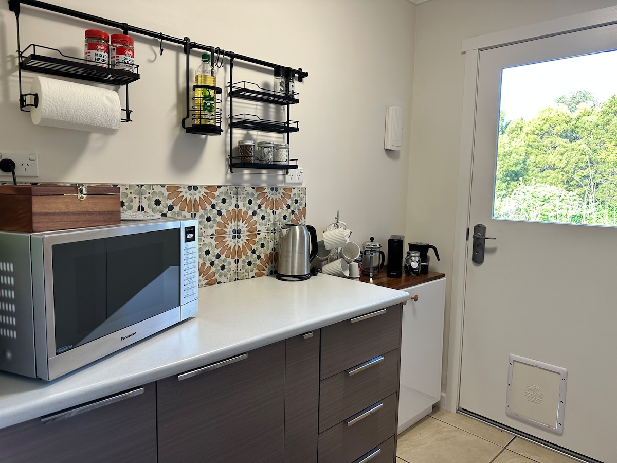 Esta elegante y espaciosa suite de un dormitorio ofrece privacidad y comodidad. Puedes acostarte en la cama y disfrutar de las vistas panorámicas a través del hermoso río Kanamaluka/Tamar a las colinas más allá y las luces brillantes de la ciudad por la noche. Disfruta de un vino local en el patio en verano o frente a la acogedora chimenea de leña en invierno mientras observas a los wallabíes, a los simpáticos pademelones o a nuestra equidna residente. Un encantador desayuno continental con artículos de panadería caseros te preparará para un día de turismo.