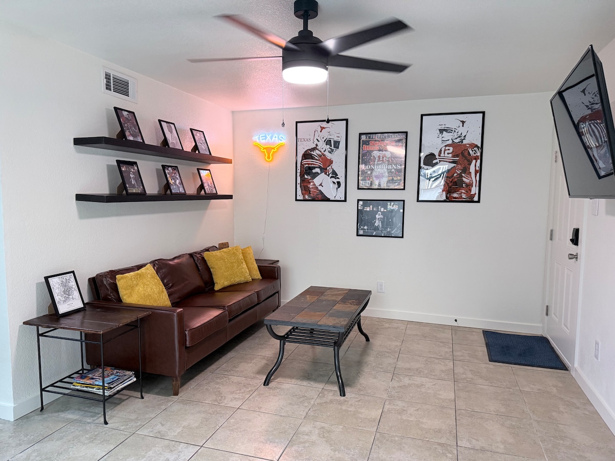 Un gran apartamento en el corazón del distrito de entretenimiento de East 6th St, lleno de restaurantes, salones, locales de música y cafeterías. Canchas de pickleball al otro lado de la calle. Edificio nuevo con gimnasio, piscina, zona de barbacoa, salón y garaje de estacionamiento seguro. Amueblado con buen gusto, con cocina totalmente equipada, lavadora/secadora, TV, internet de alta velocidad, vestidor, cómoda cama tamaño queen y sofá cama de tamaño completo. El lugar se siente genial; luces regulables, arte de artistas locales, grandes ventanales que ofrecen una gran luz natural y balcón.