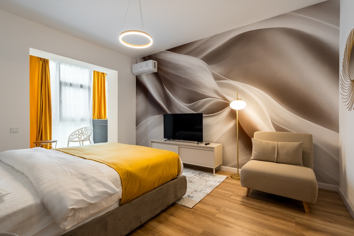 Elegante apartamento en la zona de Militari Residence en una ubicación tranquila, menos poblada pero cerca del supermercado Penny y la estación de autobuses. La cocina está totalmente amueblada y equipada y tiene un espacio para cenar. La habitación principal tiene un diván cama con 2 colchones, ropa de cama y también un armario. El apartamento está equipado con cafetera, lavadora, aire acondicionado, microondas, sandwichera, plancha y secador de pelo.