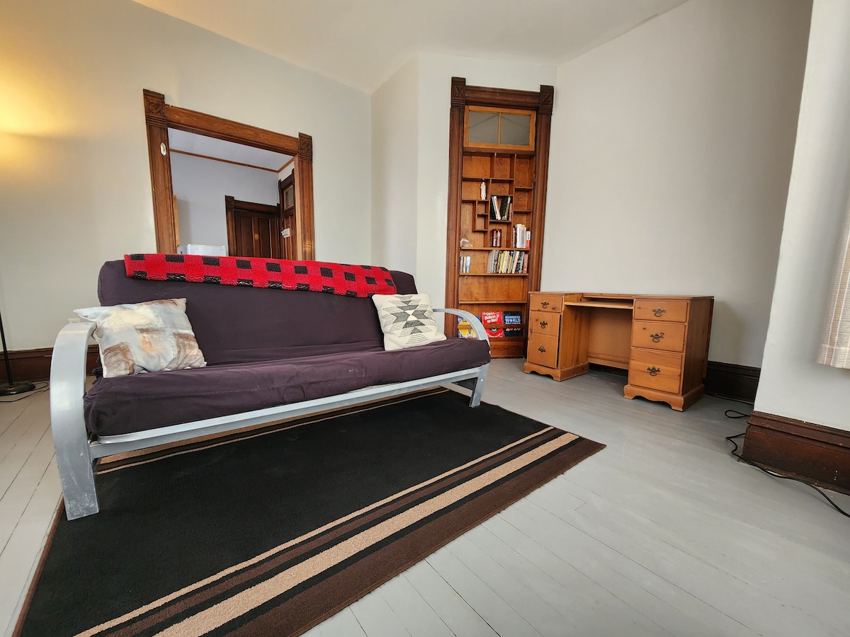 ¡Alójate en un poco de historia en el histórico Shabbona Hotel! Publicada en el Registro Nacional de Lugares Históricos, esta propiedad rezuma encanto. La habitación 6 es nuestra más grande y cuenta con cama tamaño queen, TV con Google TV, cómoda y futón convertible a cama de matrimonio. Mucha luz natural con cortinas oscuras para dormir. Los huéspedes disfrutan de acceso a una cocina completa compartida, sala de estar y baño. La propiedad está a poca distancia a pie de Shabbona Lake Park, a 20 minutos de DeKalb y a 75 minutos de Chicago.
