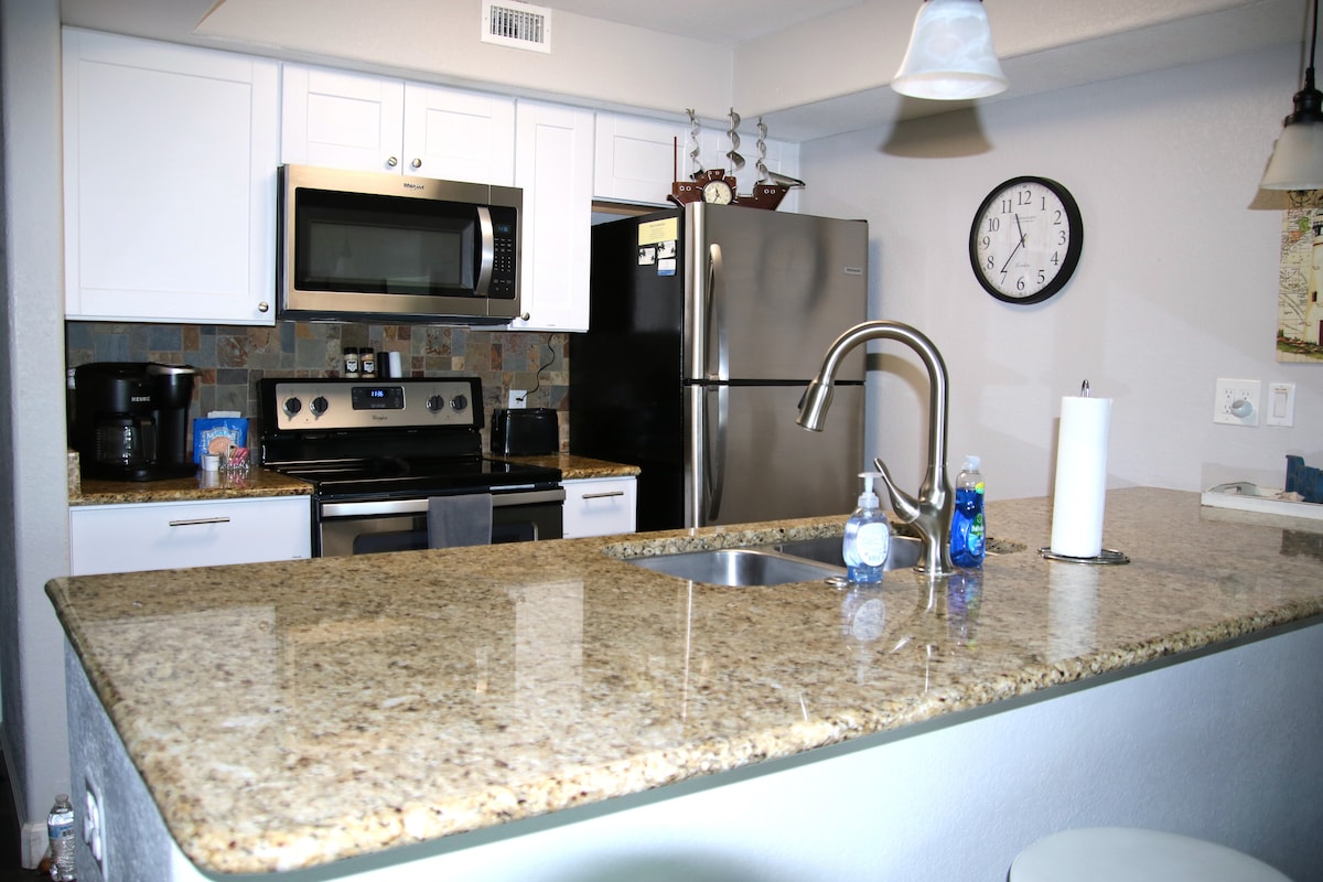 Benjamin 's Pier se encuentra en los condominios Laguna Reef completamente remodelados en la parte delantera del edificio, lejos del ruido de la cubierta de la piscina. Disfruta del sol en la piscina, pesca en el muelle iluminado de 1000 pies o simplemente disfruta de la vista desde la bañera de hidromasaje, todo ubicado alrededor del lado del agua del fondo del edificio. Esta habitación de la planta baja del lado delantero tiene dos camas tamaño queen y es perfecta para tus vacaciones familiares. ¡Disfruta de la relajación de la playa Rockport, a un corto paseo!