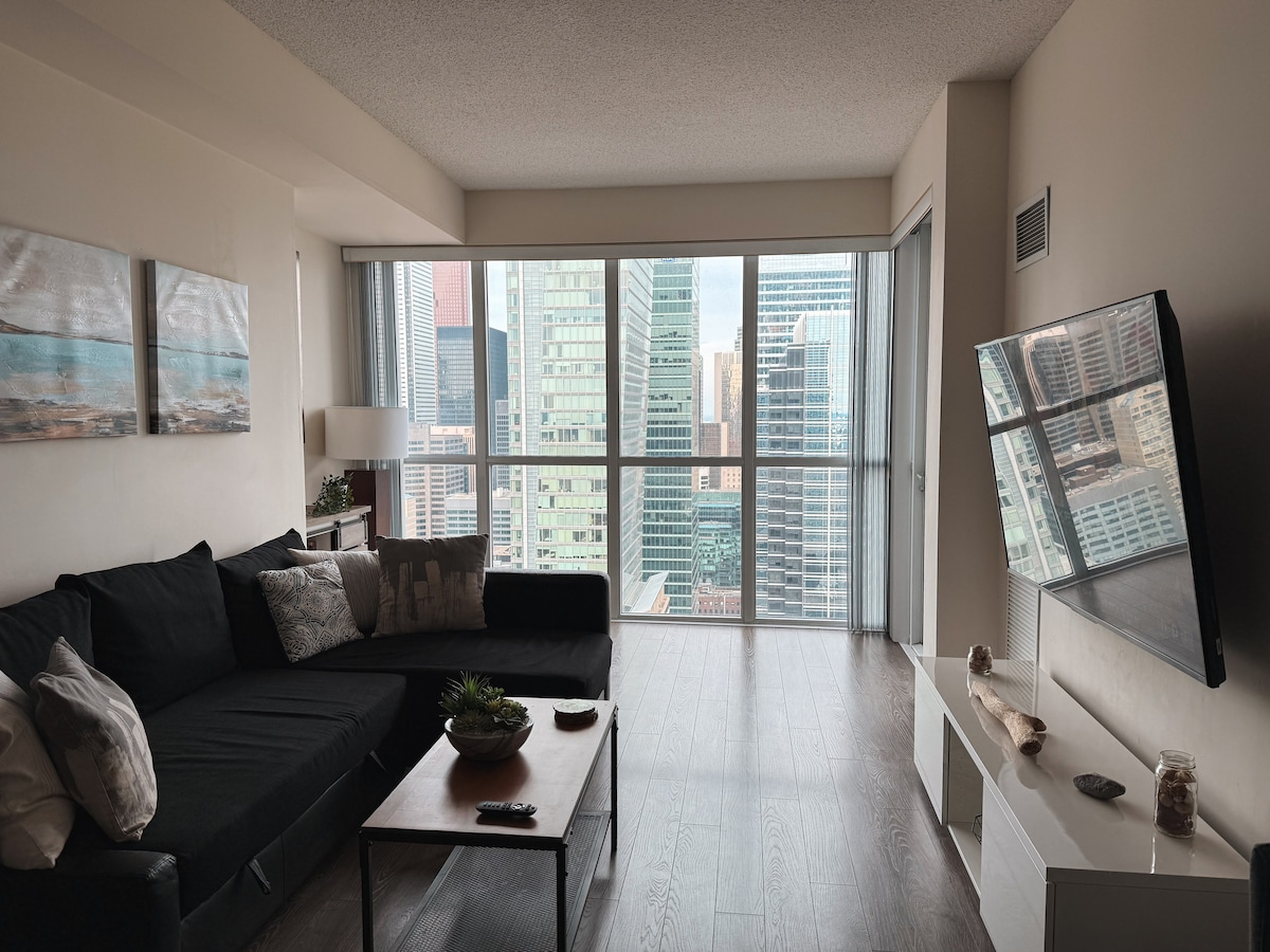 Alójate en el corazón del distrito de entretenimiento del centro de Toronto y disfruta de una lujosa vida urbana sin necesidad de conducir. Este espacioso condominio de un dormitorio más estudio ofrece impresionantes vistas de la Torre CN y el Lago Ontario, todo desde una moderna suite de gran altura. Con una cocina totalmente equipada, WiFi de alta velocidad, un televisor inteligente de 65 pulgadas con Netflix gratuito y un balcón privado con vistas a la ciudad, es el espacio ideal para turistas, familias y viajeros de negocios que buscan explorar todo lo que Toronto tiene para ofrecer.