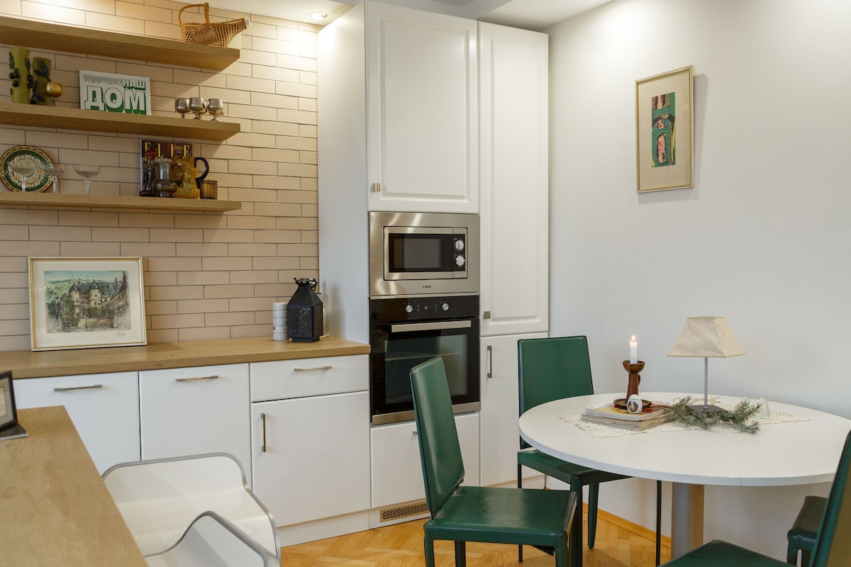 Un departamento de una habitación. El lugar en sí es hermoso, hecho con pasión y con detalles para mantener a nuestros huéspedes contentos y satisfechos con todo lo que puedan necesitar. ¡Es una gran opción para una estancia acogedora e íntima! Por lo general, ofrece un dormitorio separado con una cama tamaño king y un sofá, junto con una sala de estar, cocina y baño. Una bonita vista del río y del parque. El diseño es perfecto para parejas, viajeros solitarios o familias pequeñas. El centro de la ciudad está a 5-10 minutos despertado. No se permiten mascotas.