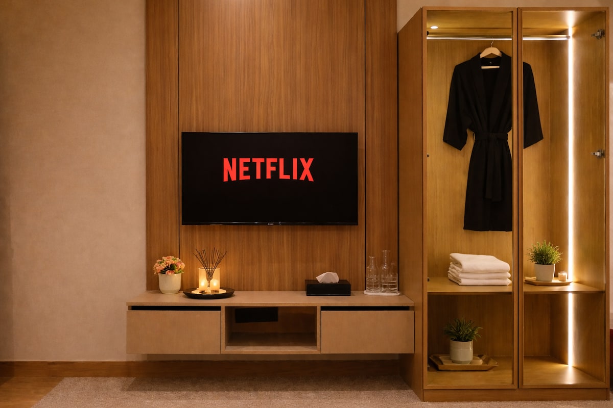 Relax in this chic, designer studio crafted for comfort and style. Enjoy warm wooden interiors, mood lighting, a plush 10-inch mattress, cozy lounge seating, and a 50-inch smart LED TV for entertainment. Located in Rohini near metro, Japanese Nature Park (Photos Attached in Additional Photos ) malls, markets, hospitals, parks, and great food spots. Perfect for couples, work stays seeking a peaceful yet well-connected retreat. More details on last image.