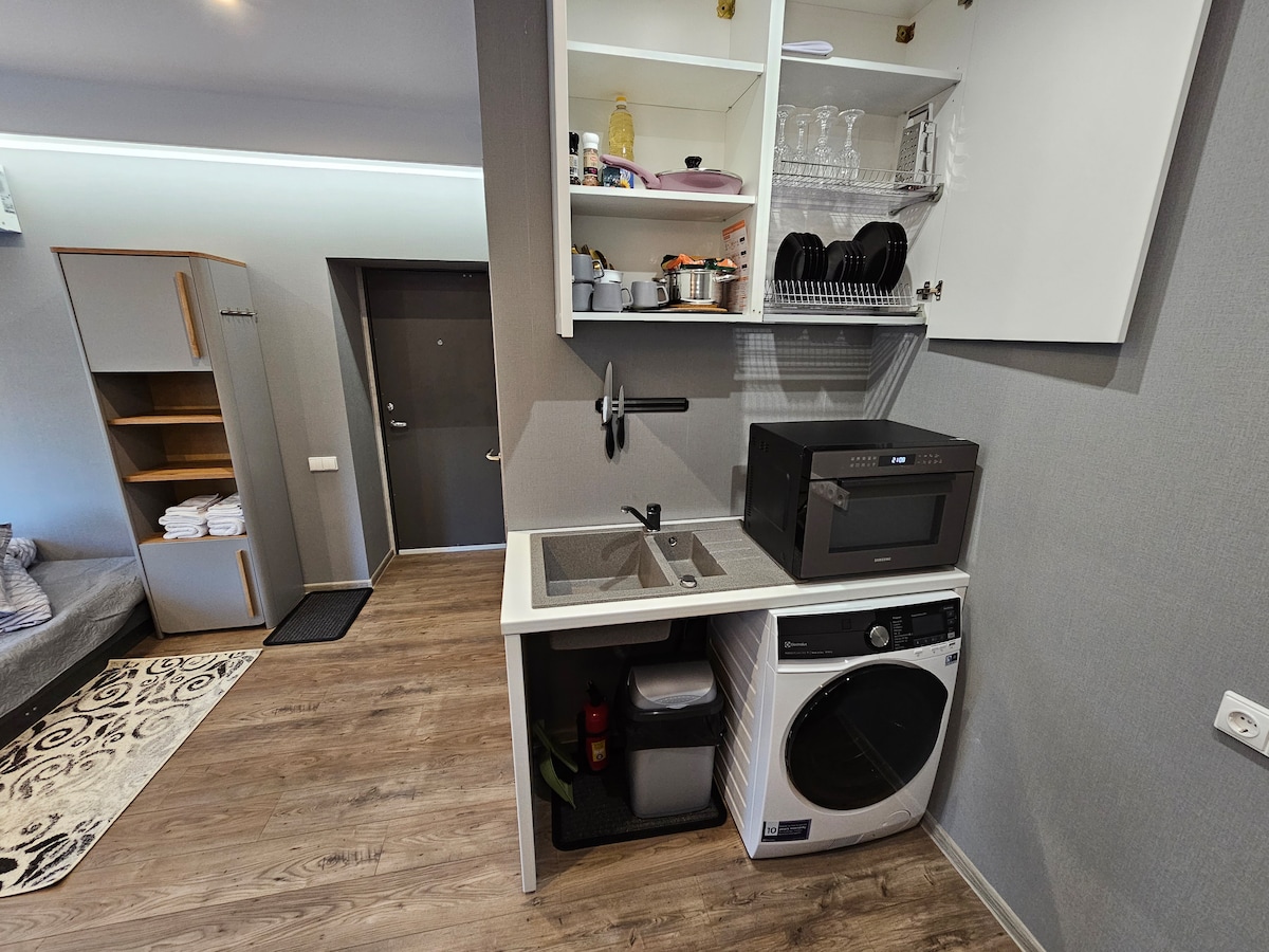 El departamento está en un antiguo edificio escolar recientemente renovado. Tiene una vista única del parque de esculturas y del hermoso lago Sartư. Las paredes están cubiertas con arcilla lituana natural que le da al apartamento un carácter único. Está lleno de detalles vintage, como la antigua estufa que todavía está en contacto para honrar su rica historia.