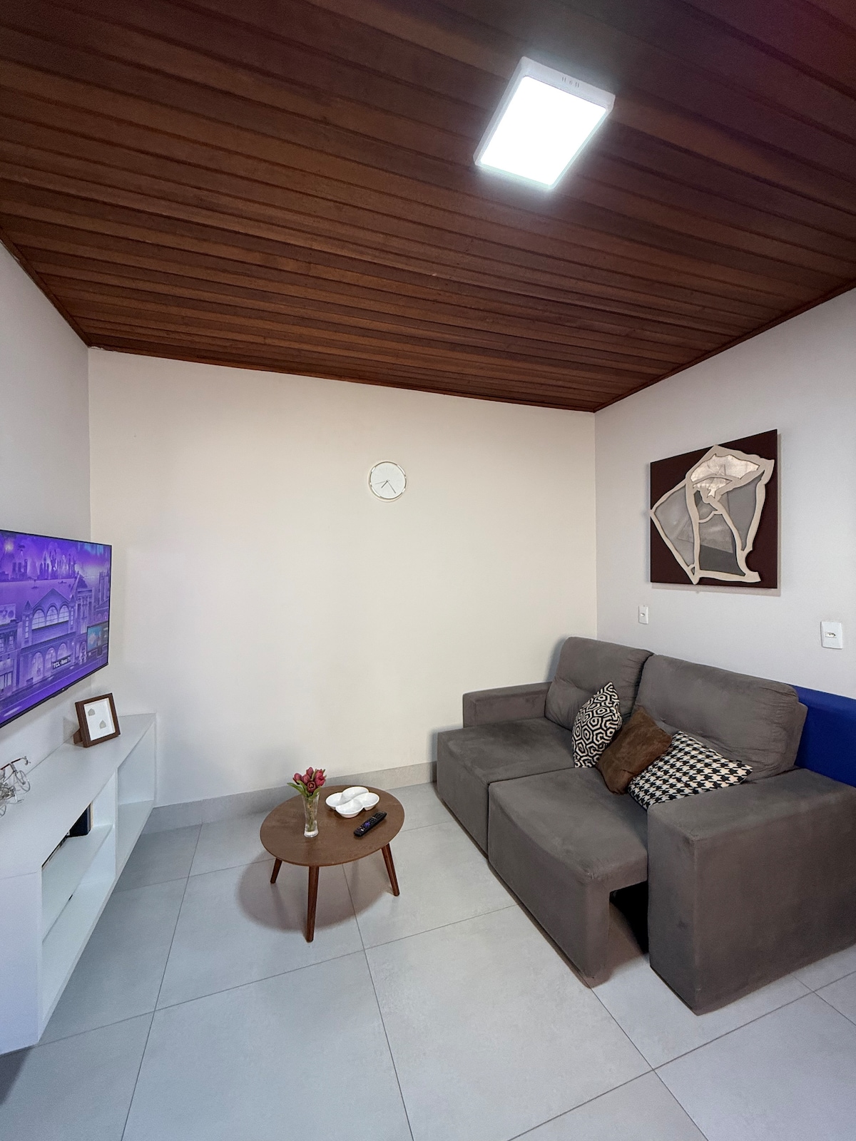 ¡Ideal para relajarse! ¡Excelente ubicación! Cerca del centro comercial, restaurantes , supermercados, farmacia, etc. - 1 dormitorio con cama doble y aire acondicionado; De 1 dormitorio con 1 colchón doble, 1 colchón individual, 1 escritorio de trabajo y ventilador de techo; - 1 baño con ducha eléctrica; - Habitación con sofá, aire acondicionado, TV de 42pies y mesa de comedor; - Cocina con estufa, nevera y utensilios. - Internet wifi y garaje para 01 auto. ¡Disfruta de la simplicidad en este lugar tranquilo y bien ubicado!