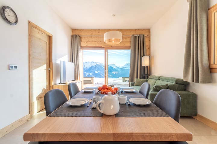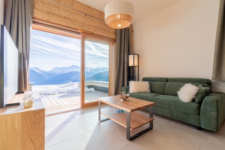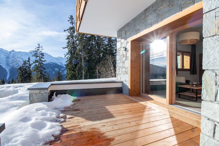 ✨ Escápese a un apartamento nuevo con los esquís puestos 🎿 con vistas panorámicas del Mont Blanc 🌄.