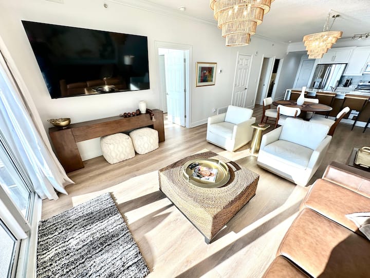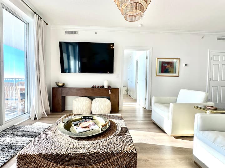 La sala de estar está diseñada para la comodidad y ofrece vistas al golfo con asientos para todos, incluido un gran sofá cama, dos sillones y dos asientos de tela y pufs. Disfruta de películas y eventos deportivos en el televisor inteligente de pared grande y de alta resolución. La cocina está completamente remodelada y cuenta con gabinetes personalizados; amplias encimeras de cuarzo extra blancas, de perfil único; nuevos electrodomésticos de acero inoxidable; cafetera; y accesorios de agua actualizados. La barra de desayuno ofrece capacidad para cuatro personas. El comedor incluye un elegante candelabro y una moderna mesa de comedor redonda y sillas con capacidad para cuatro personas.