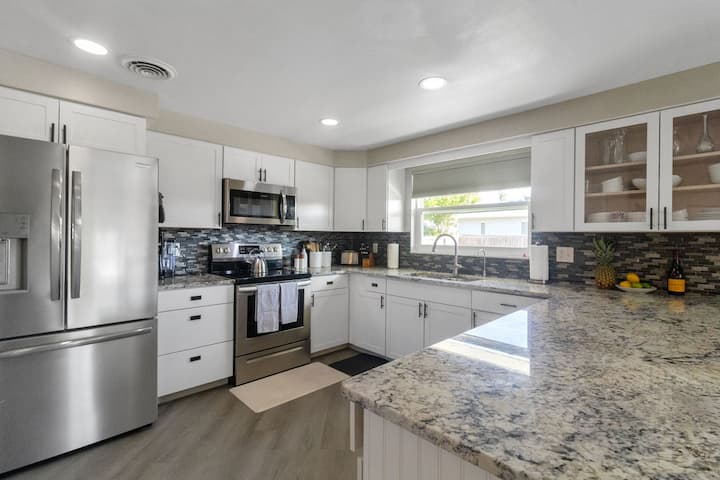 Tranquilo refugio frente al canal para un máximo de 6 huéspedes con vida interior y al aire libre. Disfruta del amanecer en la habitación costera y elegante de Florida, relájate junto a la piscina privada o explora con bicicletas y kayaks proporcionados. Barrio residencial tranquilo con fácil acceso a playas, restaurantes y atracciones locales. La casa cuenta con una cocina bien surtida diseñada para una vida vacacional fácil.
