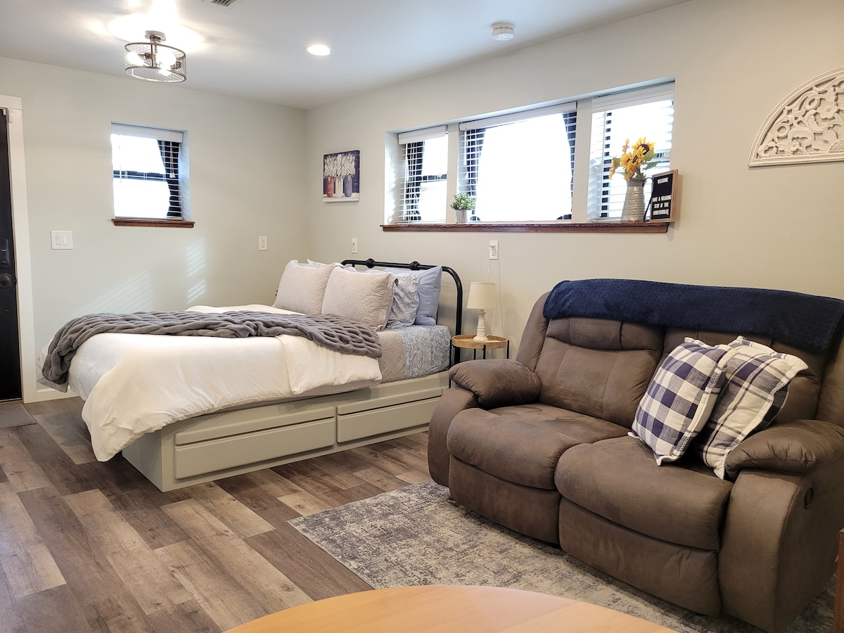 Nuestro acogedor estudio de 2 camas para 3 personas con temática de caballos es completamente privado, por lo que puedes entrar y salir con facilidad. Baño privado. Comedor. 😄Muchos aperitivos incluidos. 😋🍿 Cafetera Keurig.☕️ Muchas opciones para cocinar tus propios alimentos,🍳 con Yokes Fresh Market a solo un minuto. 🛒 En el interior: Roku TV para tu disfrute.📺 Juegos de mesa para jugar, libros. Exterior: herraduras, campo de minigolf, Corn Hole, brasero de 🔥mesa, barbacoa. Paquetes 🔥especiales para escapadas. Servicio de lavandería disponible bajo petición.🧺