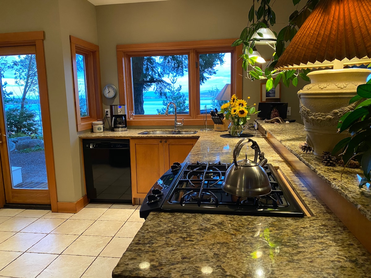 Disfruta de espectaculares puestas de sol desde nuestra NUEVA terraza más grande en nuestra hermosa casa ubicada en la MUY POPULAR zona de Rosario. A 1,5 millas de la entrada del Parque Estatal Moran con lagos, senderismo y el monte Constitution. A 2 millas en la otra dirección se encuentra el Rosario Resort. La gran suite principal tiene una bañera de hidromasaje, ducha y acceso privado a la terraza. El dormitorio de invitados tiene baño completo separado y cama tamaño queen.