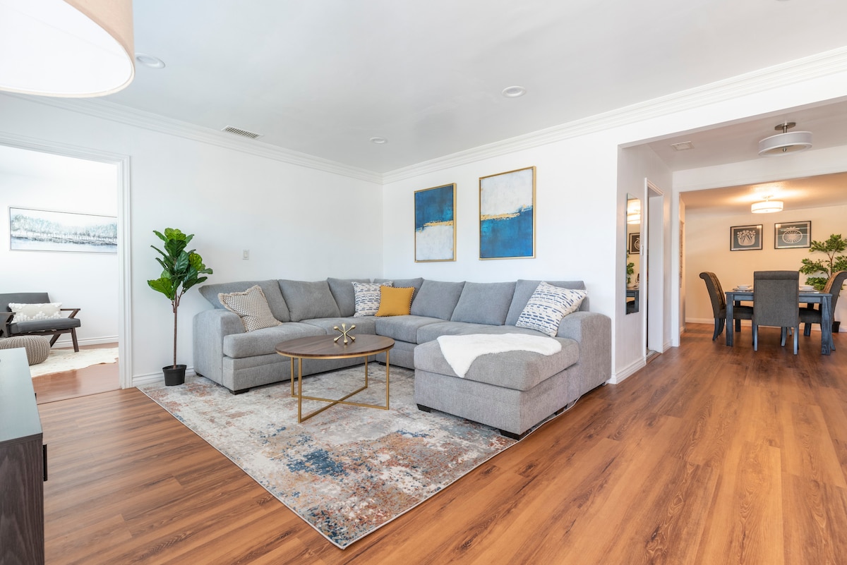 Una casa de lujo moderna, espaciosa y rara de encontrar, con muebles elegantes y una decoración cuidadosamente temática para una estancia verdaderamente única. Ubicada dentro de una propiedad cerrada, esta residencia ofrece más de 2,100 pies cuadrados de espacio habitable, perfecto para grupos que buscan comodidad y privacidad. Disfruta de la amplia suite principal de 600 pies cuadrados para un toque extra de indulgencia. Ubicado en el centro de todas las atracciones: Centro de Los Ángeles: 12 millas Universal Studios Hollywood: 21 millas Disneylandia – 23 millas Aeropuerto (LAX) – 32 millas