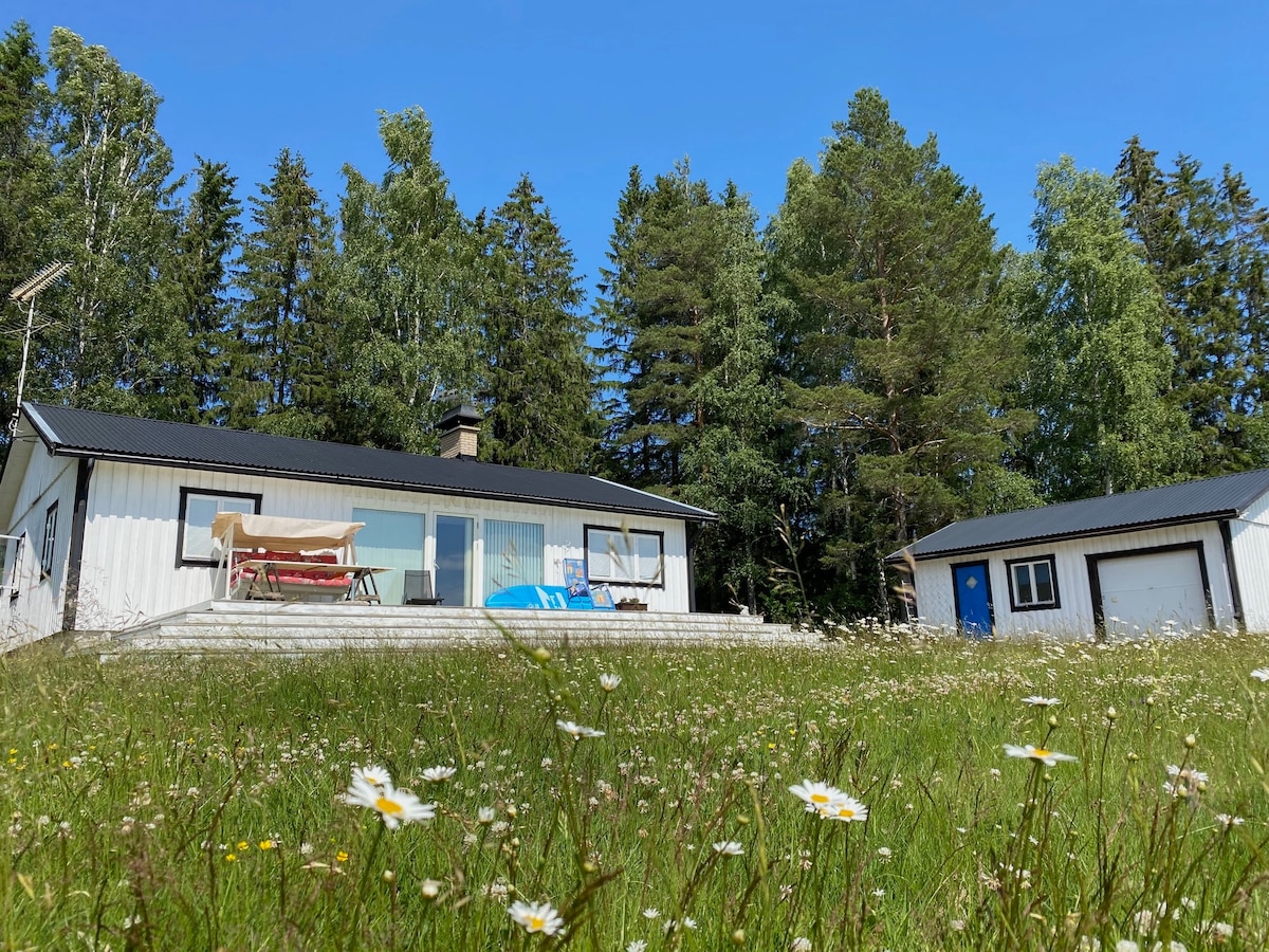 Una típica y encantadora casa roja sueca en un entorno encantador junto a un lago (a 2 minutos a pie) con tu propio lugar de baño con plataforma, acceso a barco y una canoa para hasta 3/4 personas y pesca gratuita (puedes pedir prestado equipo de pesca sencillo). Casa principal totalmente equipada con 3 dormitorios. Además, 1 casa pequeña disponible con 4 camas. Es muy tranquilo y silencioso aquí y verás las ovejas y los caballos pastar cerca de la casa.