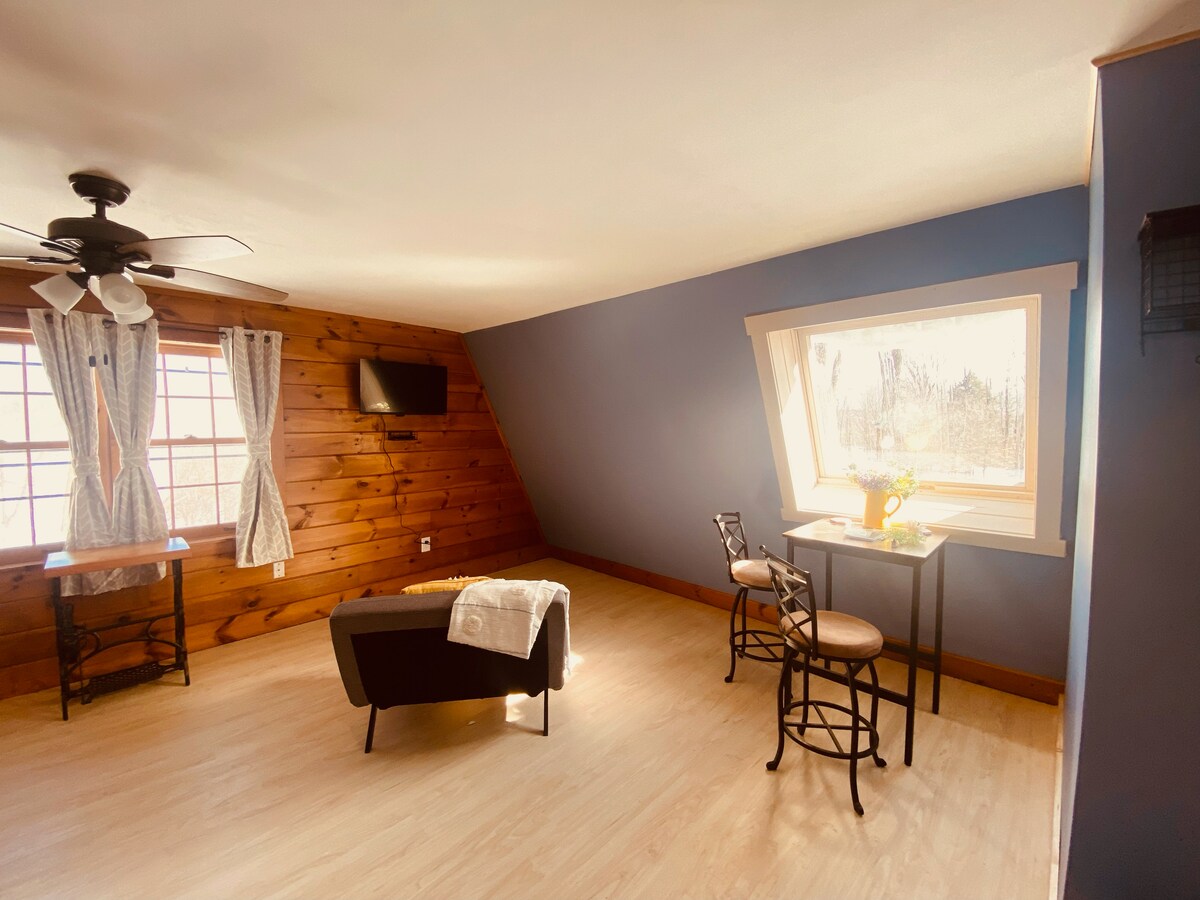 ¡Relájate en este espacio tranquilo y silencioso! Este apartamento tipo estudio está encima de un garaje/entrada compartida con el propietario. La propietaria, su hija y 2 perros muy amigables viven en la propiedad. La cabaña se encuentra en 5 acres con un hermoso patio y estanque que puedes disfrutar. El estudio está a 5 minutos de la ciudad; restaurantes locales, estación de tren y teatro son algunas de las pocas atracciones. La autopista está a 7 minutos. 3 millas de camino de tierra ¡Las colinas y senderos de Vermont esperan tu aventura!