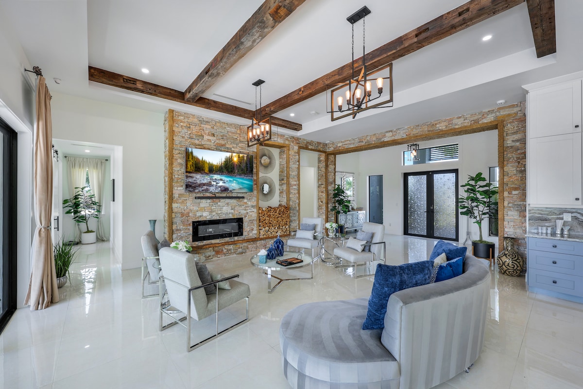 El estado del sol está llamando, y la vida de lujo te espera en esta moderna y espaciosa casa de Cape Coral. Trae a tu familia a esta casa de 4 dormitorios y 3 baños y disfruta de sus amplias comodidades. Esta casa cuenta con una cocina totalmente equipada, TV inteligente en todas las habitaciones y una chimenea eléctrica. Relájate todo el día en el patio privado o salta a la piscina si necesitas refrescarte. Prueba los restaurantes locales justo al final de la calle, te bronceas en la playa o simplemente disfruta de una comida al aire libre en la parrilla. ¡Tu próxima escapada te espera!