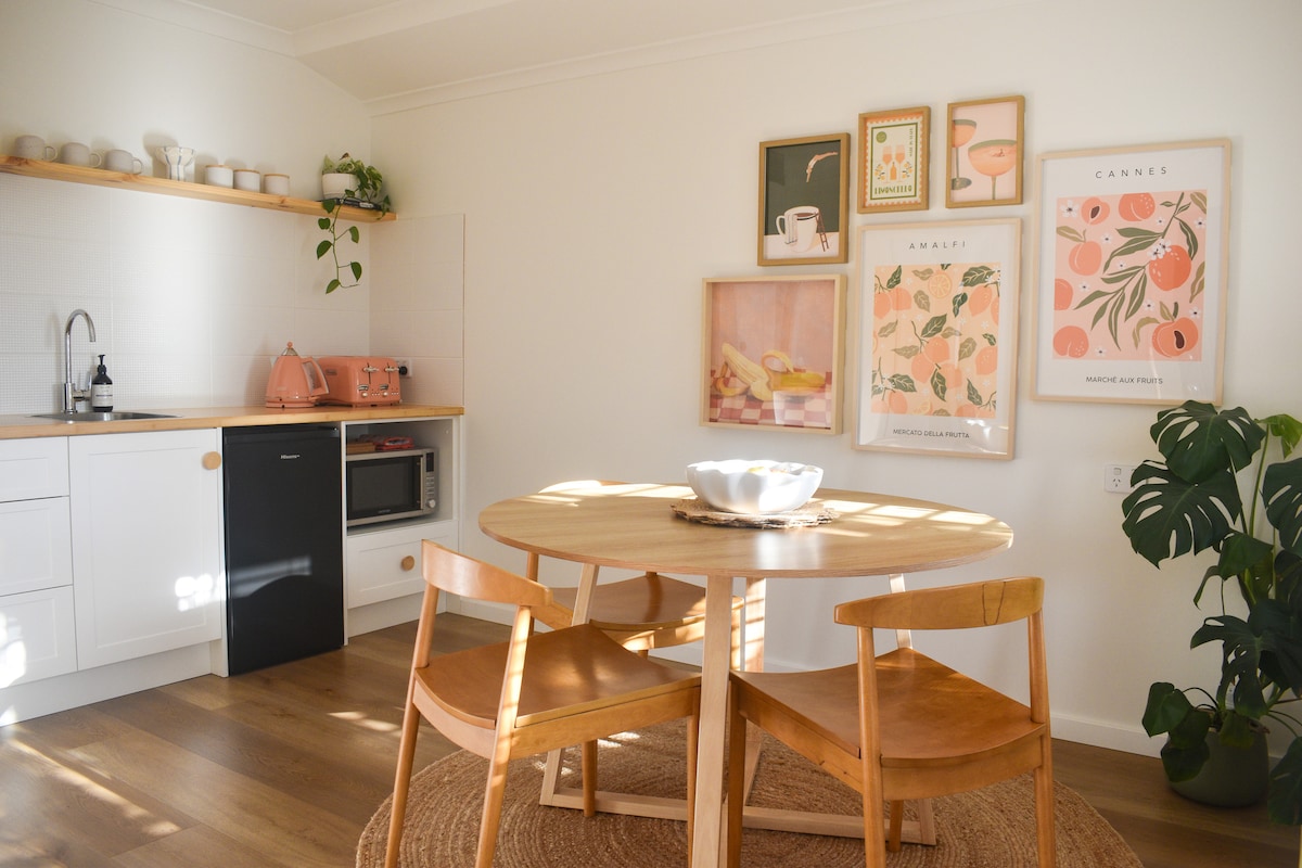 Siéntate y relájate en este estudio personalizado, elegante y privado. Ubicado entre jardines paisajísticos, bosque natural, abundante vida silvestre y todo a 3 minutos en auto de la ciudad o la playa. ¡Playa Meelup! Despiértate con el canto de los pájaros, camina entre el bosque o simplemente siéntate en la terraza y empápate del ambiente tranquilo. Muy cerca de una selección de bodegas, restaurantes y cervecerías con senderos para surf, playa, ciclismo y senderismo para rematar. Te prometemos que no querrás irte.