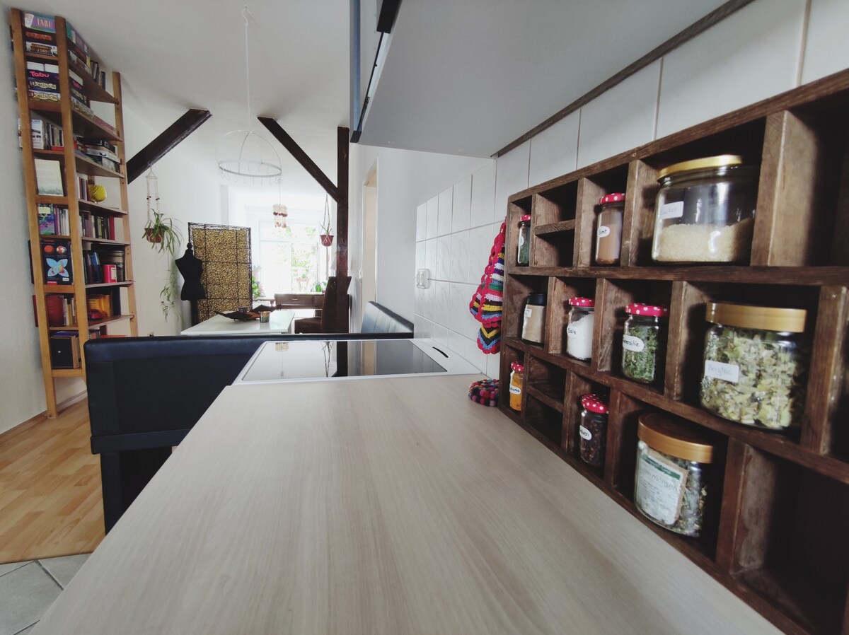 Disfruta de un buen rato en el elegante apartamento «LOLIDA». Después de 2 años de reformas, hemos redecorado nuestra villa protegida «Studio 13» para ti. Situado en el romántico barrio de Giebichenstein, no muy lejos del zoológico de montaña. En pocos minutos a pie se llega a la playa de la Saale hellem Strande. El barrio es conocido por sus bares y restaurantes especiales, así como por su oferta artística y cultural. ¡Bienvenidos! Se puede añadir una cama supletoria a petición.