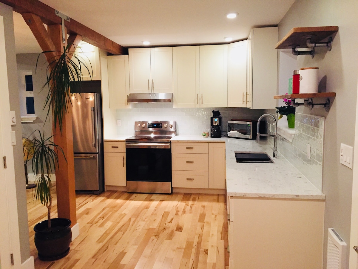 Relájate en este espacio tranquilo y elegante. Date un capricho con un lujo relajado. **La altura del techo es de 6’** (6’2” en la cocina) Cafetera espresso, sábanas finas, baño con calefacción por suelo radiante, bidé, productos de ducha locales de primera calidad y cocina pequeña convenientemente surtida y artículos para el desayuno. Esta es una suite independiente con entrada de teclado. Hay una lavadora y secadora combinadas en la suite. ¡También alquilamos nuestro auto en Turo! ¡Disfruta de un entorno hermoso y tranquilo, en medio de la naturaleza, con una ubicación práctica y cerca de la acción!