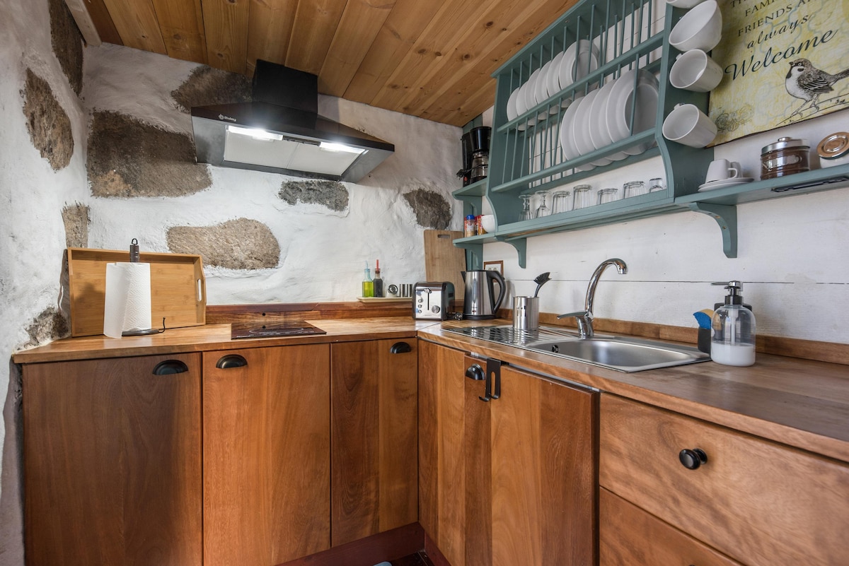 Este espacioso granero convertido de un dormitorio es ideal para quienes disfrutan de estar rodeados de naturaleza. Nuestra casita rústica ha sido renovada para incluir una moderna cocina, sala de estar y comedor con espectaculares vistas al mar y al valle. La propiedad tiene su propia terraza con impresionantes vistas panorámicas del Valle de Orotava y el Océano Atlántico hasta la isla de La Palma. También le ofrecemos el uso compartido de un spa / jacuzzi en la finca.