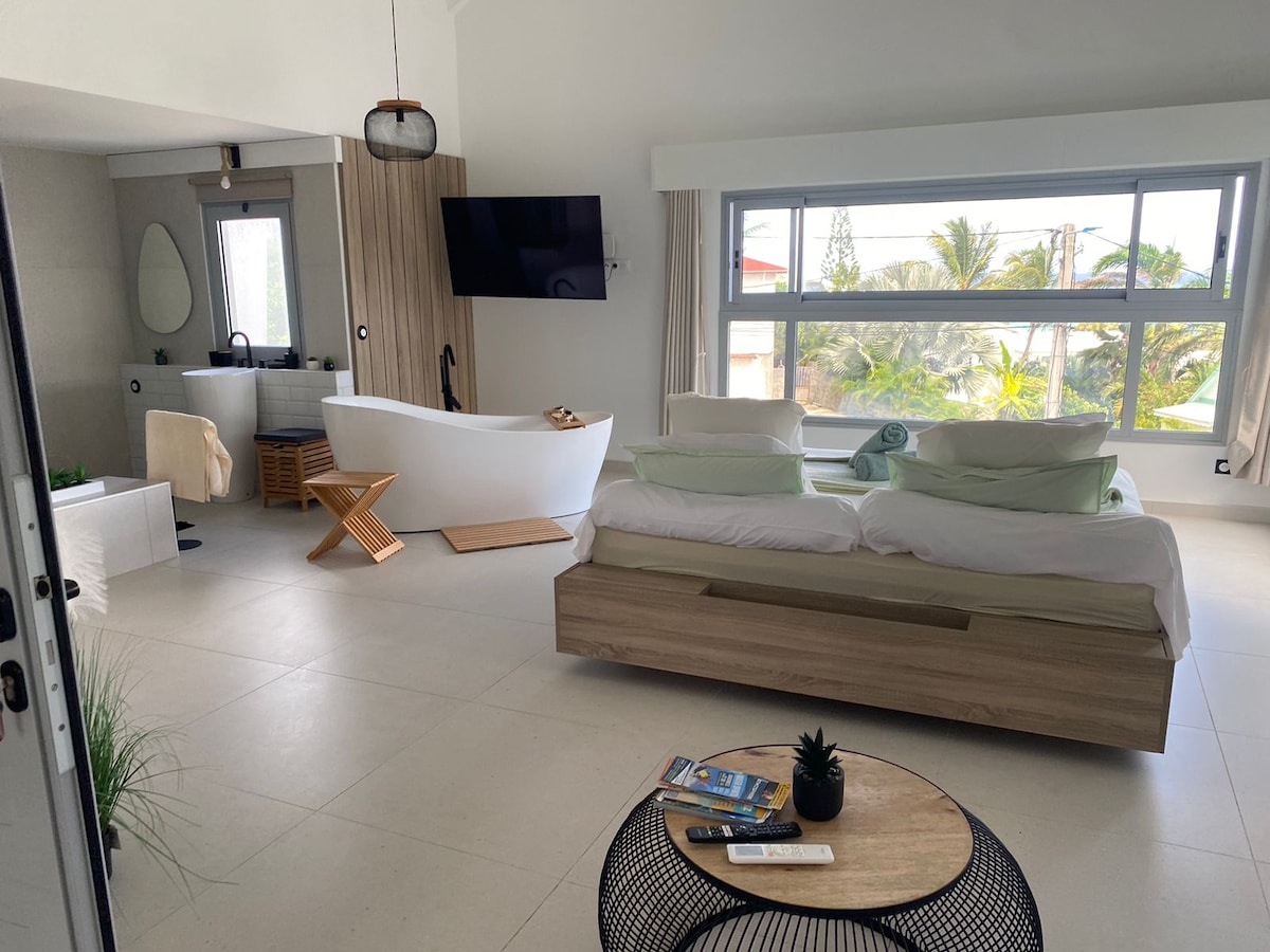 Studio « Mahana ☀️ » Situé en plein cœur de la station balnéaire de St-Francois, à deux minutes à pieds de la marina, localisation exceptionnel pour profiter de vos vacances. Le studio est très cosy et bien aménagé, il allie calme, confort et proximité avec tous les commerces. La résidence dispose d’une piscine Le studio est entièrement équipé et le linge de maison est fourni ; serviettes de toilettes, draps etc… wifi, télévision, Climatisation, sèche cheveux.