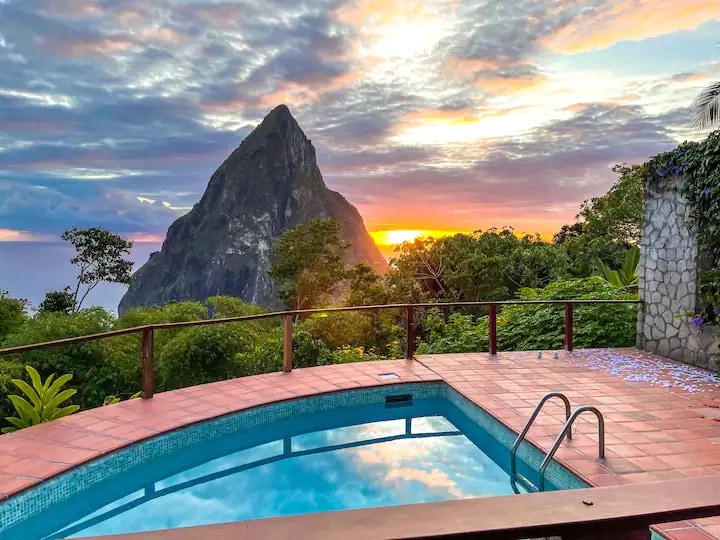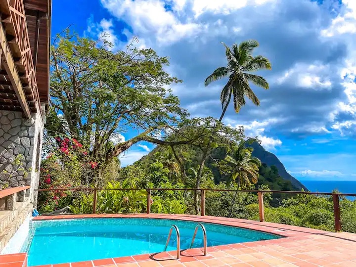 Nuestra hermosa villa rústica aislada está ubicada en una exuberante cresta de volcán en la finca Rabot en un acre privado de jardines florecientes, con impresionantes vistas al icónico Petit Piton y al mar Caribe. La propiedad se ha renovado recientemente e incluye una nueva piscina de agua salada de borde infinito de 37' con dos lados. A pocos minutos se encuentran las atracciones más populares de Santa Lucía, hermosas playas, baños de barro de azufre y buena comida. La ciudad portuaria de Soufriere está a solo 10 minutos en coche. El desayuno está incluido.