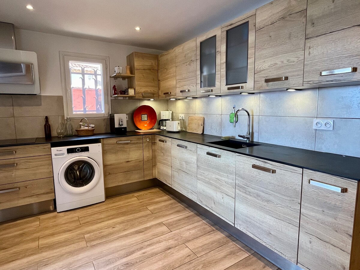 Relájate en esta hermosa villa zen con vistas a la Riviera Francesa en un jardín privado cercado a pocos pasos de la playa en una comunidad cerrada. Esta casa de 50 metros cuadrados está completamente renovada con un gran ventanal y vistas al mar y al jardín desde todas las habitaciones. Cuenta con un dormitorio separado con baño, una cocina totalmente equipada con comedor, una sala de estar con sofá seccional, un área de trabajo dedicada con aire acondicionado, acceso a Internet de alta velocidad con Starlink, 2 televisores inteligentes grandes, lavadora, estacionamiento privado y almacenamiento.