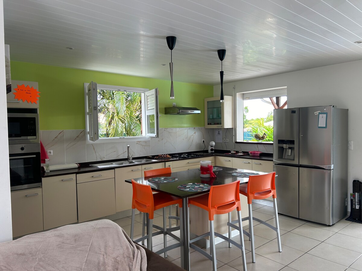 Villa situada en Sainte-Anne, a 1 km de la playa de Pointe Marin a 2 km de la playa de Anse Caritan cerca de las playas es ciudades. Las habitaciones tienen aire acondicionado Majolia se define como un espacio soleado, cómodo y agradable donde vivir: plaza de APARCAMIENTO gratis para el coche en frente de la casa. El primer desayuno Jardín Ti-punch. Vivienda bien ventilada Agua fría y caliente Conexión Wifi de alta velocidad Barbacoa Nevera Se proporcionan toallas + playas Terraza etc...
