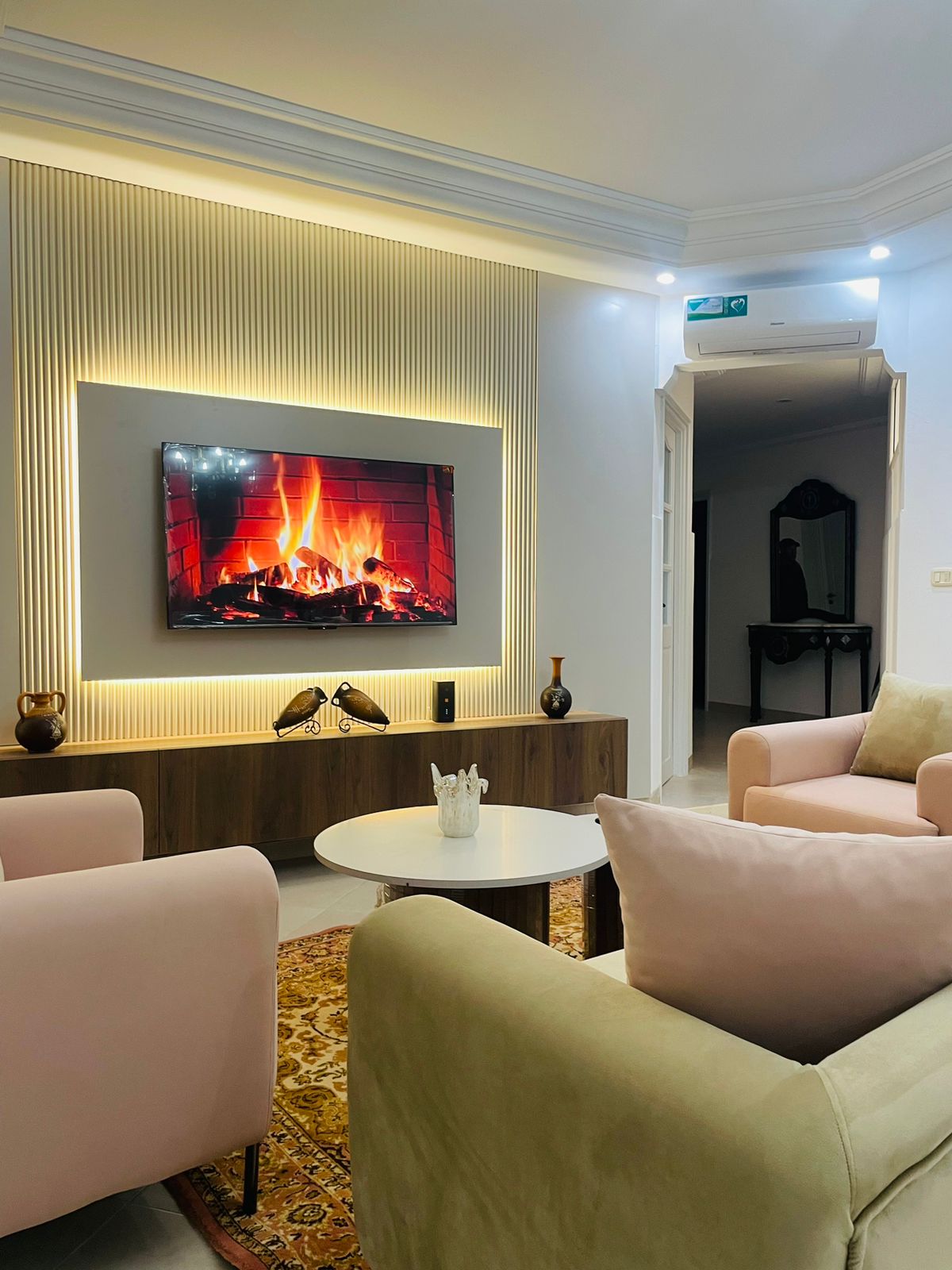 Encantador apartamento con una acogedora sala de estar, equipado con 2 cómodos sofás y un televisor, complementado con una zona de comedor rústica para cuatro personas. Decoración fresca en verde y blanco, creando un ambiente cálido, perfecto para relajarse o recibir invitados. Escapada urbana ideal».