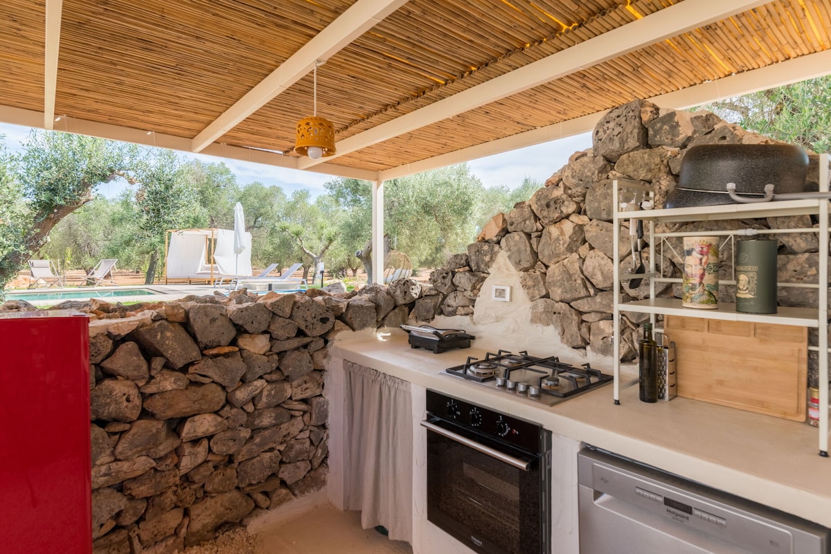 Esta villa y trullo de 1780, llamado trullo Fedele Bonotto, han sido completamente restaurados, pero aún se encuentran entre los olivos centenarios de la zona. Admira las históricas paredes de piedra, relájate en la piscina privada y el solárium, y disfruta de la hermosa zona del jardín, todo exclusivo para los huéspedes y su privacidad. El personal que se encarga de la limpieza de los espacios externos e internos de la propiedad sigue estrictamente las normas sanitarias previstas para la COVID-19. Antes de la llegada de cada huésped, se lleva a cabo un saneamiento completo. El tamaño de la casa y el gran jardín garantizan absolutamente las distancias de seguridad social y sin contacto. La villa, con olivos centenarios, tiene un comedor y una cocina totalmente equipada con utensilios y vajilla, lavavajillas, nevera y horno. Gracias a un pasillo se llega a los dos dormitorios dobles, cada uno con su propio baño. Separado de la villa, con entrada independiente, se accede al trullo, de unos 50 m2 de superficie, donde hay una cama doble, un sofá cama doble y un baño privado. En la zona exterior hay una gran mesa con 10 sillas, varios asientos, una barbacoa y la piscina para uso exclusivo de los huéspedes. También está unido a la villa el cuarto de la caldera con lavandería, completo con lavadora. ¡Toda la estructura es para uso exclusivo de los huéspedes que pueden vivir en estos momentos inolvidables de descanso y tranquilidad! Los huéspedes tienen el uso exclusivo de toda la villa y del trullo adjunto, y de toda la zona al aire libre, que incluye la sala de estar, la piscina y la lavandería. Inmersa en la impresionante campiña, la casa está situada cerca del centro de Ceglie Messapica. Cena en excepcionales restaurantes de propiedad familiar, navega por los mercados locales y da un paseo a pie o en bicicleta por los valles. Tienes un aparcamiento para tu coche, en 20 minutos llegas a las playas del mar Adriático, en 30 minutos puedes llegar a las playas del mar Jónico.