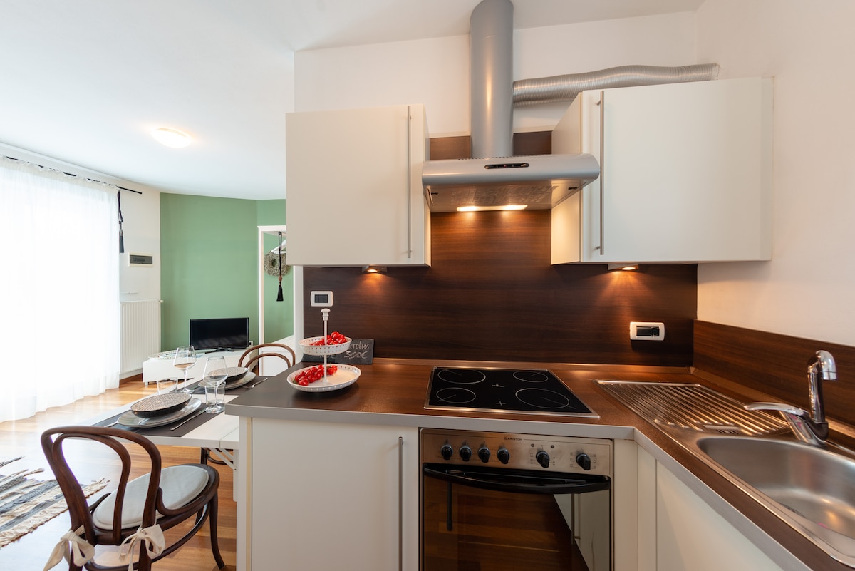 Este elegante apartamento de 2 habitaciones (57 m²) ha sido completamente renovado y ofrece todo lo que necesitas para tus vacaciones en el centro de Merano. En la zona de entrada, hay un armario abierto y un banco. El baño cuenta con una gran ducha y un inodoro con bidé. En la sala de estar, hay una cocina con servicios esenciales, un comedor y un gran sofá cama (180x 200 cm). En el dormitorio, hay una cama doble grande (180x 200 cm) y un armario abierto.
