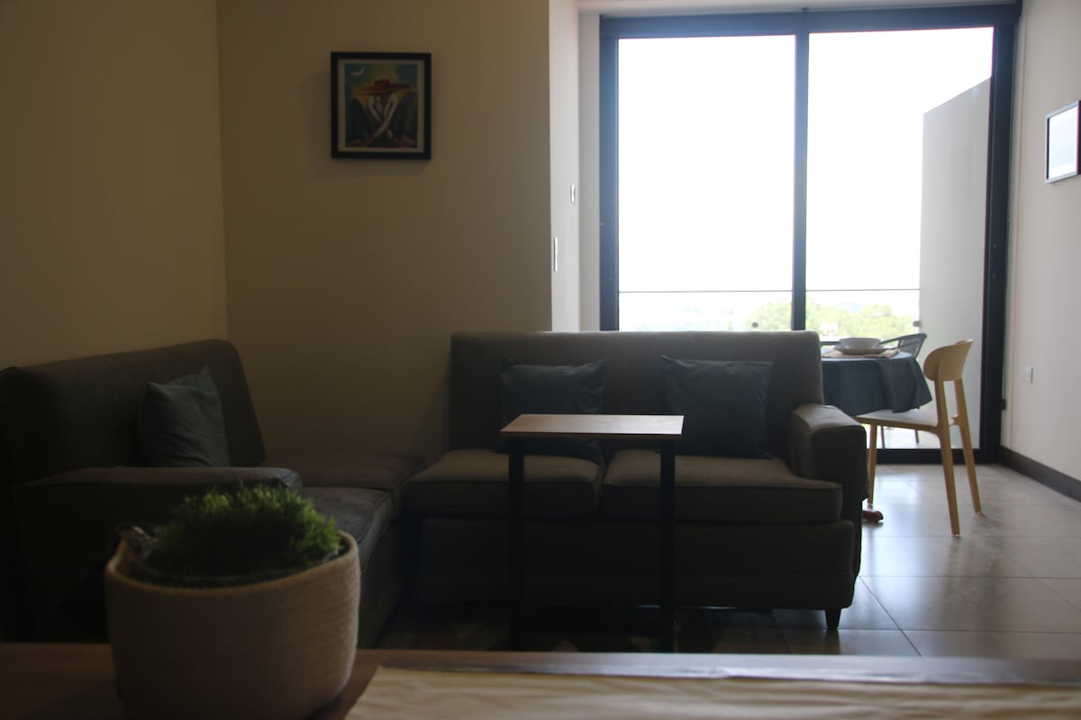 Lindo y acogedor apartamento con vista espectacular desde el balcón a los volcanes Agua y Pacaya. A diez minutos del aeropuerto. Cuenta con cama Queen y sofá cama, cocina equipada, aire acondicionado, Smart TV, baño privado y parqueo gratis. El edificio cuenta con restaurantes, tienda de artículos básicos, seguridad, recepción 24 horas, lavandería y terraza común. Ubicado frente a Plaza Berlín, una de las plazas más lindas de Ave. las Américas, ideal para pasar un momento al aire libre. .