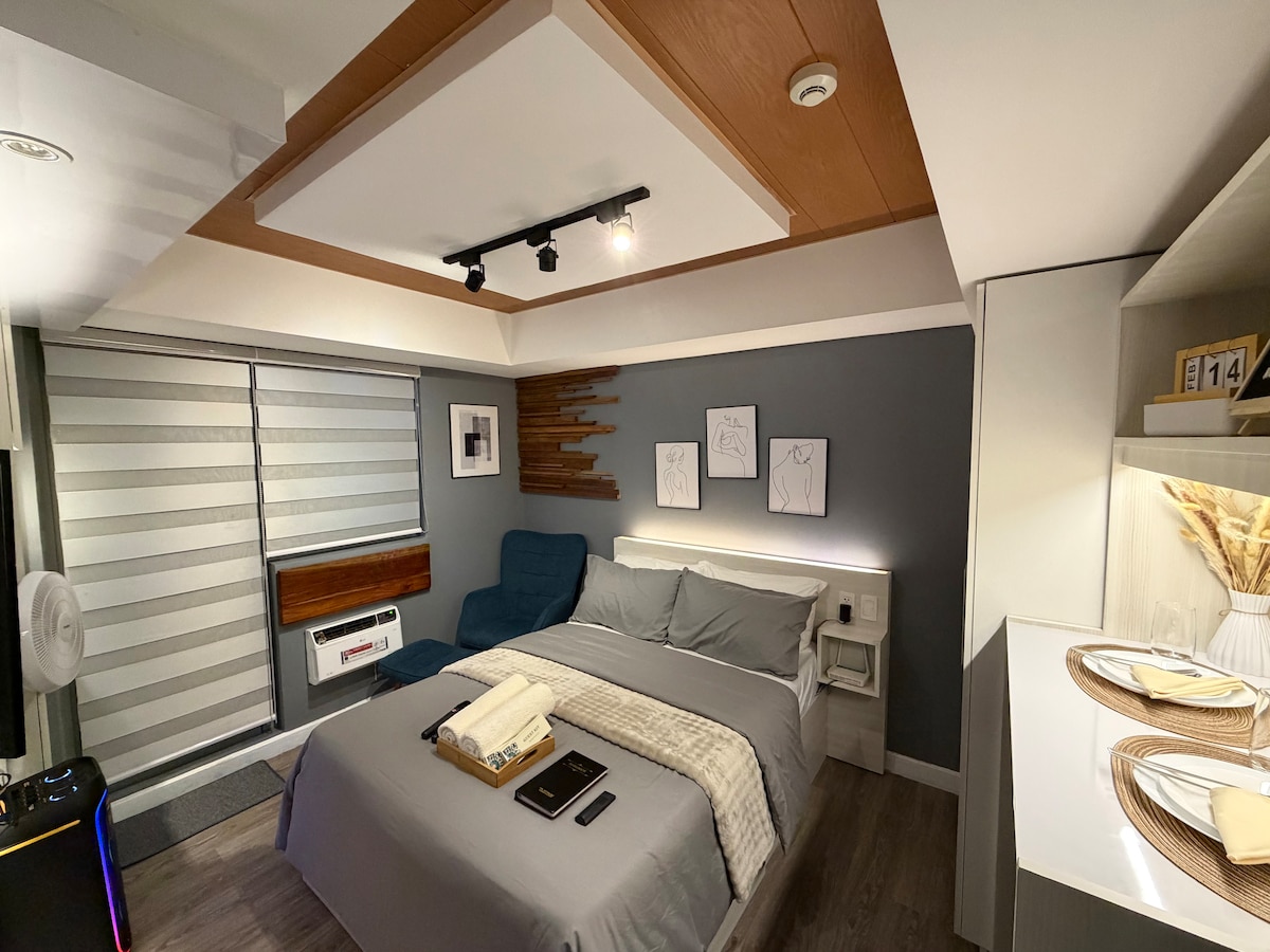 Escápate a un refugio romántico moderno en Azure North Pampanga. Este elegante alojamiento cuenta con un amplio balcón con impresionantes vistas a la piscina y a la ciudad, perfecto para tus noches de vino o café por la mañana. Disfruta de interiores acogedores, iluminación ambiental y un ambiente sereno ideal para parejas, familias o personas que se relajan solas. Ubicado en un edificio de primera calidad con comodidades de estilo resort. Tu estadía de ensueño comienza aquí.