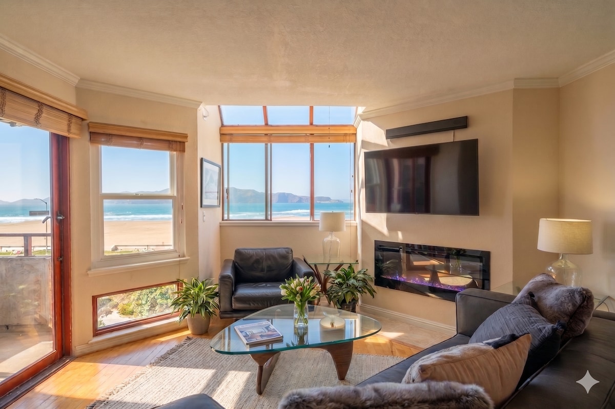 Relájate con estilo con impresionantes vistas al mar y atardeceres dorados en este remodelado refugio costero 2B1B, a solo 15 minutos de SFO y San Francisco. Ubicado en el segundo piso de un dúplex y a pocos pasos de la playa, es ideal para avistar ballenas, surfear o pasear tranquilamente por la orilla del mar. Las ventanas de gran tamaño llenan el espacio con luz natural y vistas impresionantes. Disfruta de electrodomésticos inteligentes completamente nuevos, muebles elegantes, estacionamiento gratuito debajo de la unidad y luces y TV controladas por voz para una estadía relajante y sin problemas.