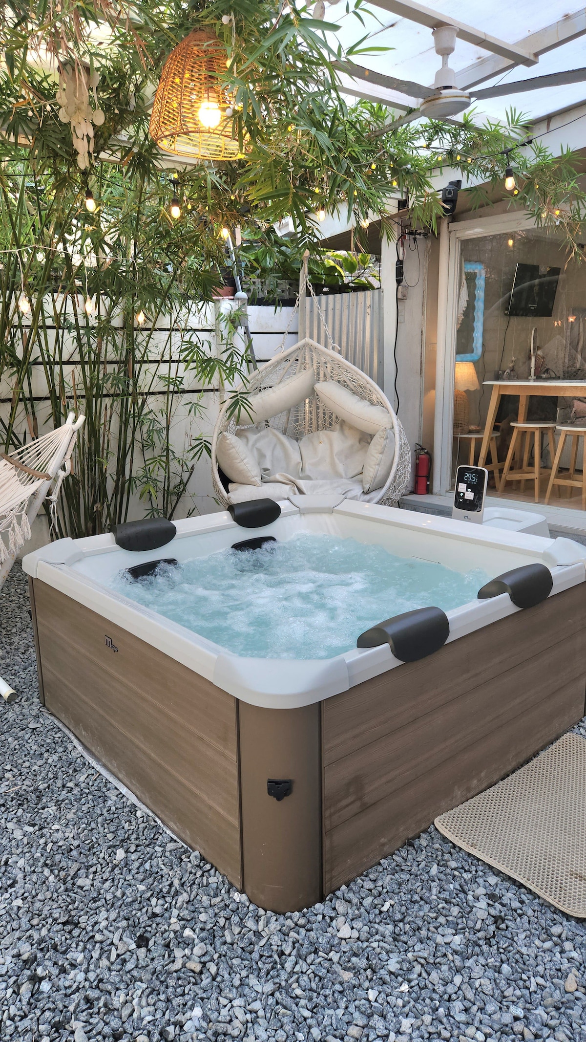 Bienvenido a su sereno escape de la agitada vida de la ciudad. A solo 45 minutos del aeropuerto Clark, a 15 minutos de las playas y a 5 minutos de Royal Duty Free, esta acogedora suite de 30 metros cuadrados se abre a un patio con bañera al aire libre, parrilla y comedor. CARACTERÍSTICAS NOTABLES: >Camas cómodas > Bañera al aire libre >Ducha caliente >Patio trasero para mascotas >Wifi >Parrilla. > Cena al aire libre >Hamaca >Cocina pequeña > Pueblo cerrado > Seguridad las 24 horas >Aire acondicionado >Admite mascotas* > Tarifas adicionales después de los primeros 2 huéspedes *con usuario de feed en él