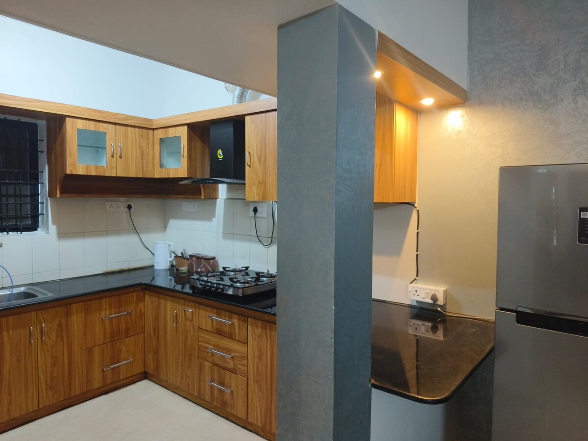 ¡Escápate a este refugio de alta tecnología de 2BHK a solo 1 hora de Bangalore! Perfecto para viajes de trabajo, fiestas o estadías románticas. Aspectos destacados: 🏊 Piscina privada: piscina de 20x12 pies + césped de 300 pies cuadrados. 🎬 Noches de cine: proyector en patio + Smart TV. 🔒 Privacidad total: puerta automática y paredes extendidas. 💻 Preparado para trabajar: wifi de alta velocidad y purificador de aire. 🍳 Cocina completa: barbacoa, nevera, microondas y agua RO. Entrega de comida a través de Swiggy/Zomato. ¡Se admiten mascotas! 🐾 Horario de silencio: de 10:00 p. m. a 6:00 a. m.