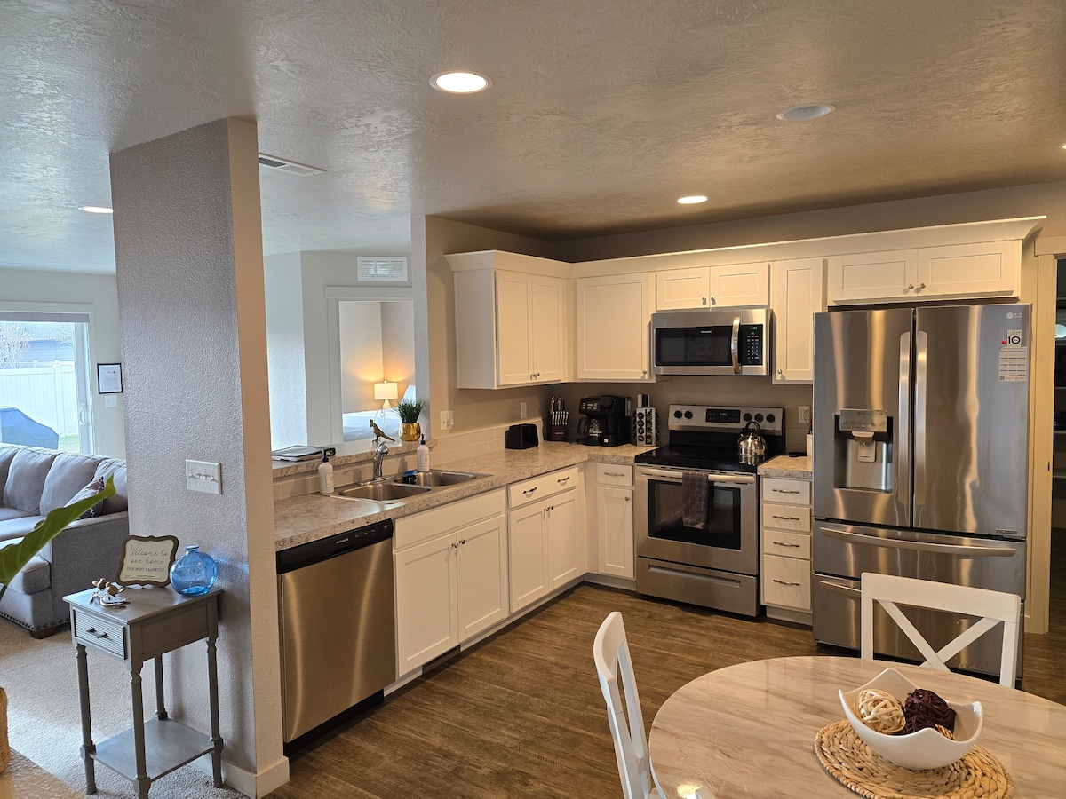 Joya tranquila del país: tómate un descanso de lo ajetreado y relájate en un alojamiento espacioso solo para ti con vistas preciosas a los pastos y a las colinas de Emmett. El ETownHouse Airbnb se encuentra a menos de una milla del corazón de Emmett y de los recintos feriales de rodeo. Tiene un plano de planta abierto (3 dormitorios, 2 baños - 1.800 pies cuadrados) y una gran cocina con tragaluces. El porche trasero es un patio cubierto con preciosas vistas. Este alojamiento comparte una entrada dividida. También contamos con una mochila portátil y juegos y una silla alta para los más pequeños.