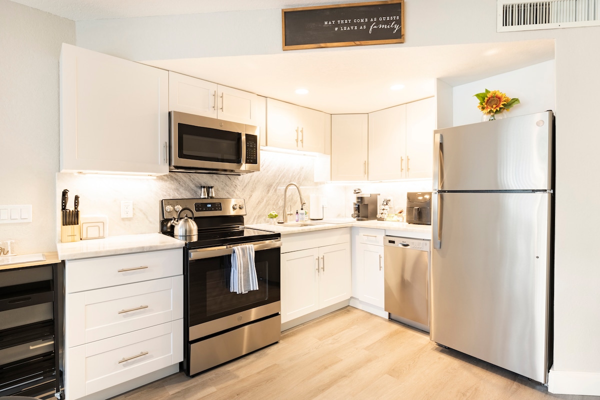 ¡Recientemente renovado! Este departamento ahora tiene un baño, una pequeña cocina y una entrada privada. Se puede utilizar para vacaciones de trabajo o familiares. Se encuentra como una extensión de la casa con acceso a la casa principal. La habitación tiene televisión de 55pulgadas en el dormitorio y televisión de 65pulgadas en la sala de estar. También tendrás acceso al resto de la casa, que incluye mesa de billar, patio con barbacoa e instalaciones de lavandería. Estás a 15 minutos en coche del mar. Ofrecemos sillas, sombrilla y nevera para la playa.
