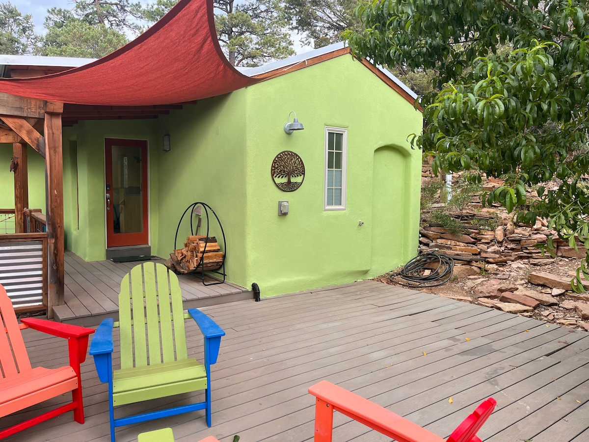 Una acogedora casa de campo enclavada entre los pinos ponderosa y piñon, cerca de Abiquiu. Este refugio de montaña ofrece amplias vistas desde las ventanas y la terraza. La propiedad limita con el Bosque Nacional de Santa Fe y Poleo Creek está a poca distancia a pie. Relájate en esta escapada especial... lee, medita, echa una siesta... La casa del árbol es una joya arquitectónica. Piense en una vida pequeña con un diseño inteligente. A 30 minutos en coche del hermoso lago Abiquiu y del país de Georgia O'Keefe. Le esperan aventuras al aire libre.