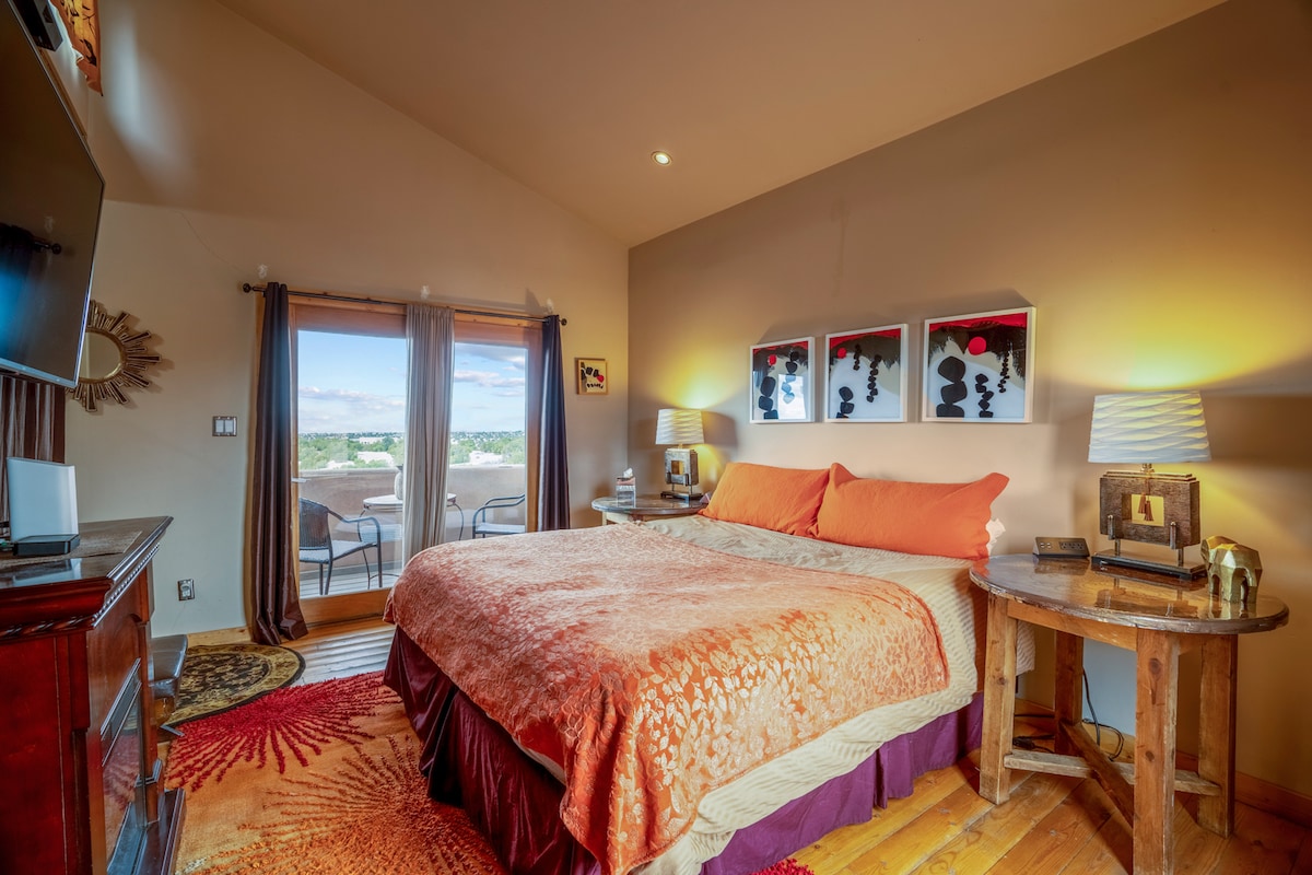 ✨ Estudio romántico de girasol en un tranquilo santuario forestal 🌲 1 milla de la plaza, 1,6 millas de Canyon Rd; estacionamiento fuera de la calle, entrada privada, baño y cocina totalmente surtida. • Jacuzzi 100 % privado con bajo contenido químico. • Sauna + inmersión en frío 🔥❄️ • Trufas de chocolate 🎁 • Proyector para noches de cine 🍿 • Barra de café y té orgánicos ☕️ • Batas cómodas 🧖🏼♀️ • Iluminación ambiental 🕯️ Wifi rápido • Aire acondicionado + calefacción Limpieza no tóxica y sin fragancias. Junto a nuestra casa con insonorización y privacidad. 🐶 ¡Bienvenido!