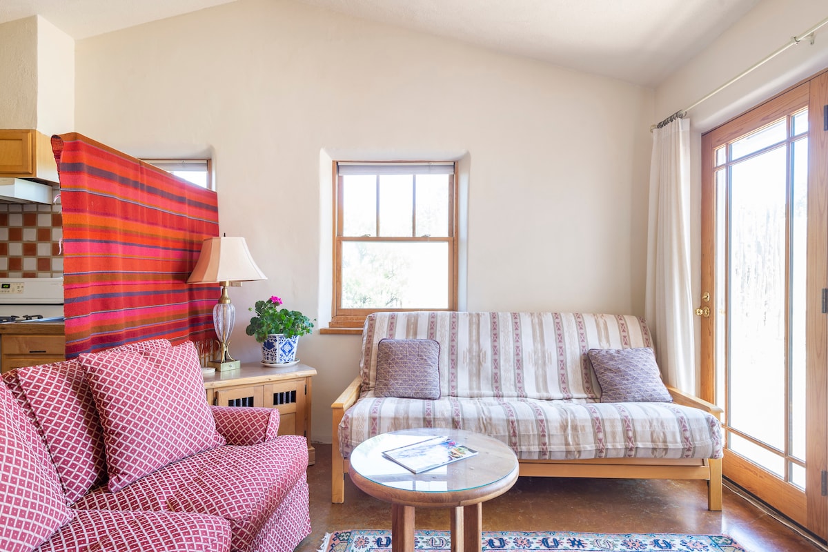 Las puertas francesas de tu suite bellamente decorada con sala de estar y cama cómoda se abren a un entorno rural que es muy tranquilo. Disfrutarás de impresionantes vistas a la extensión del desierto al sur y a las montañas cubiertas de pinos al norte. Contempla esas famosas puestas de sol de Nuevo México después de un día de actividad en el centro histórico de Santa Fe, a solo 20 minutos. Cerca de senderismo, aventuras al aire libre, restaurantes elegantes, museos, lugares de interés, actividades culturales y toda la magia que Nuevo México tiene para ofrecer.