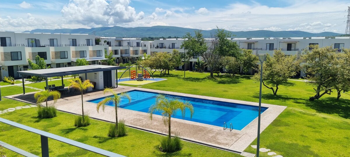 A 20 minutos del centro de Cuernavaca, totalmente equipada y muy confortable, cuenta con 2 habitaciones con Aire Acondicionado c/u, 2 baños completos y 1/2 baño en PB, terraza, comedor, cocina y patio de servicio, que harán de tus días una estancia cómoda y agradable. La privada cuenta con una piscina con chapoteadero (para los más pequeños), juegos infantiles y una palapa donde puedes pasar un día tranquilo con tu familia y/o amigos. ¡Bienvenido!