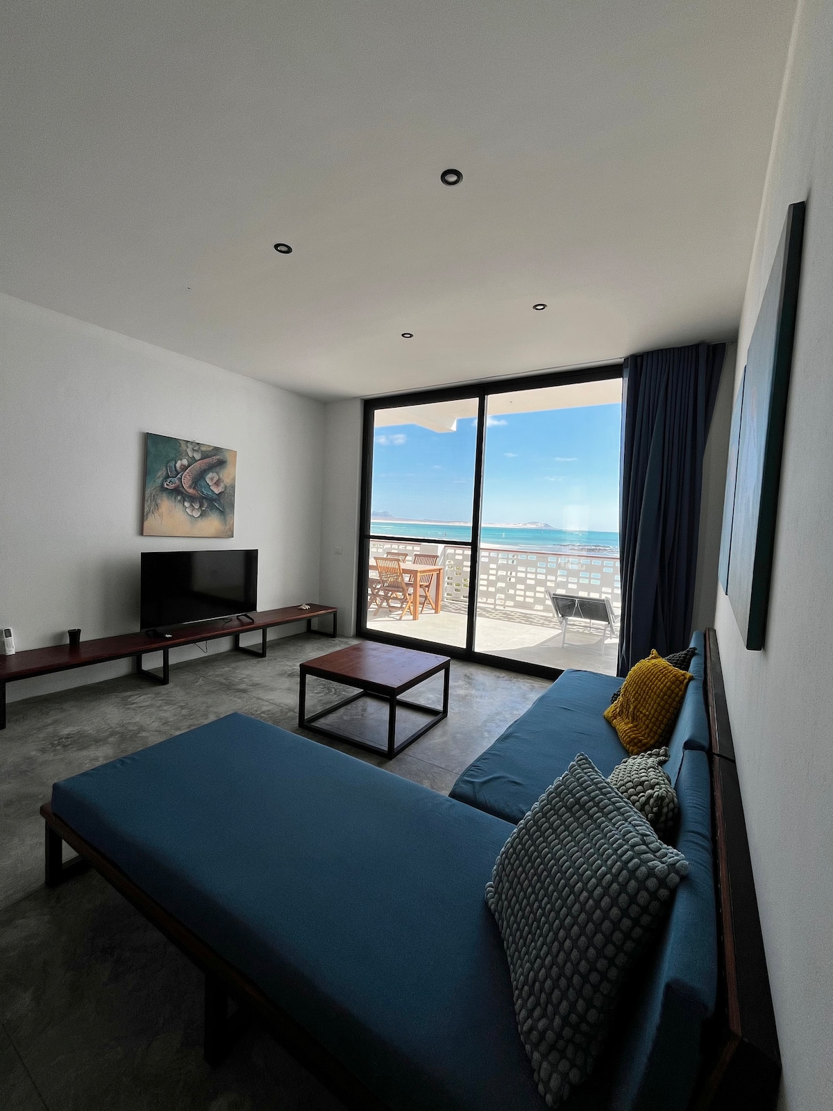 Situado a 200 metros del centro de Sal Rei, a 300 metros de la playa de enfrente, a 400 metros de la playa de Cabral y a 650 metros de la playa de Estoril, el apartamento ofrece la ubicación perfecta para aquellos que quieren explorar las hermosas playas de Sal-Rei y tener fácil acceso a mercados y restaurantes. El apartamento es moderno, está bien equipado, tiene habitaciones amplias y una decoración exquisita con una vista deslumbrante del islote de Sal Rei, las playas de Estoril y Chaves. Habitación suite con armario y balcón con vista al mar.