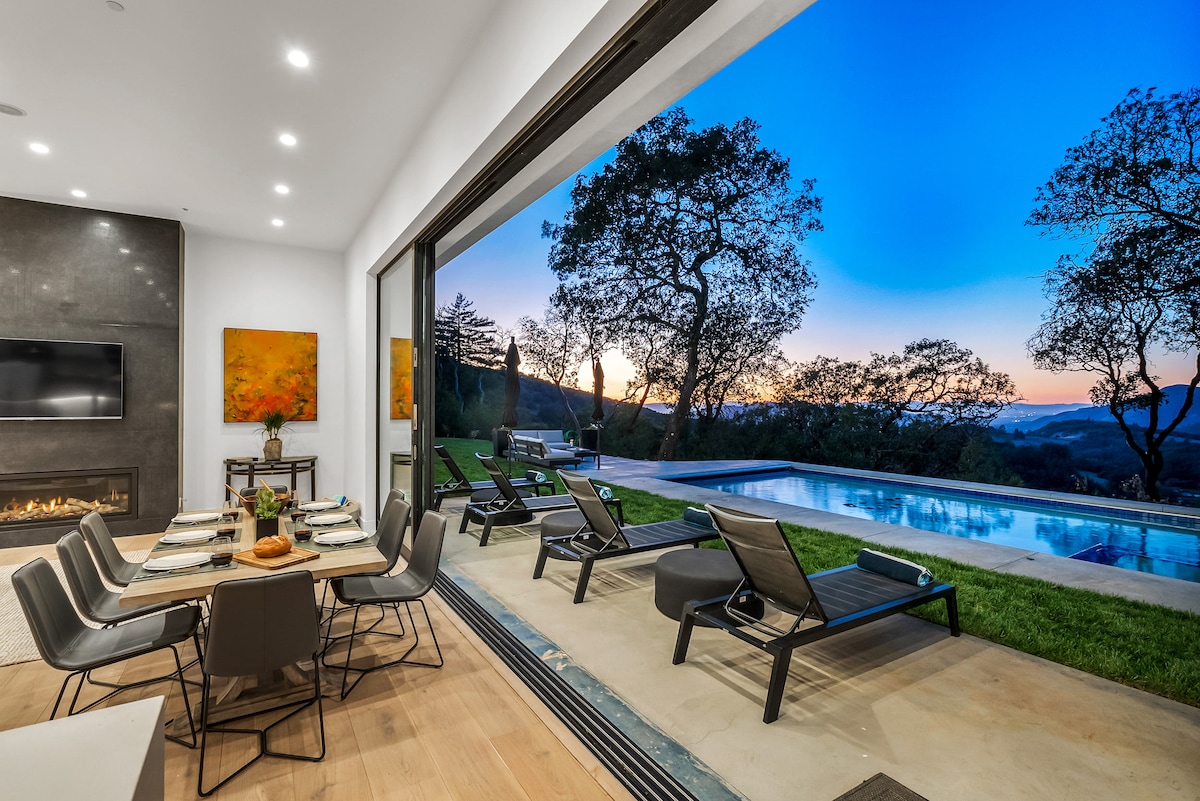 Welcome to Sunset Ridge, where the beauty of wine country unfolds before you. - Stunning interiors with soaring ceilings - Seamless indoor-outdoor living - World-class sauna and pebblestone saltwater pool - Expansive hilltop views - Gourmet kitchen and elegant dining for 10 - Game room and home gym - Five luxury beds across three bedrooms and a Casita - Complimentary 1GB Fiber Optic Internet