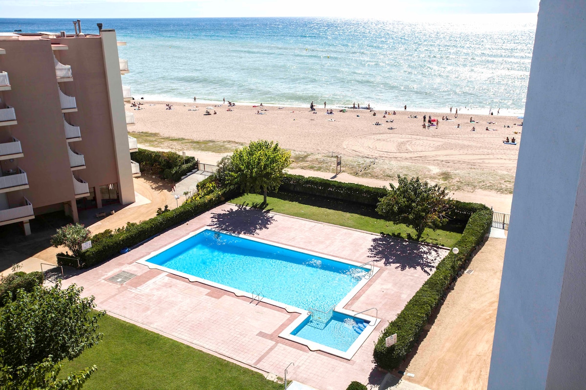 Gran apartamento de 110 m., junto al mar, en la misma playa, ,gran terraza y PARKING privado. Vistas espectaculares (comedor todo vidrieras) y 2 PISCINAS (horario 10 a 23,jun/sep) con zona ajardinada (muy cuidada), 3 habitaciones orientadas al mar y gran zona ajardinada. Dos baños completos con bañera. A 45 min. de Barcelona y 30 del aeropuerto de Girona. Muy bien equipado ,con aire acondicionado y calefacción. Jardines y parque infantil al lado de la finca.