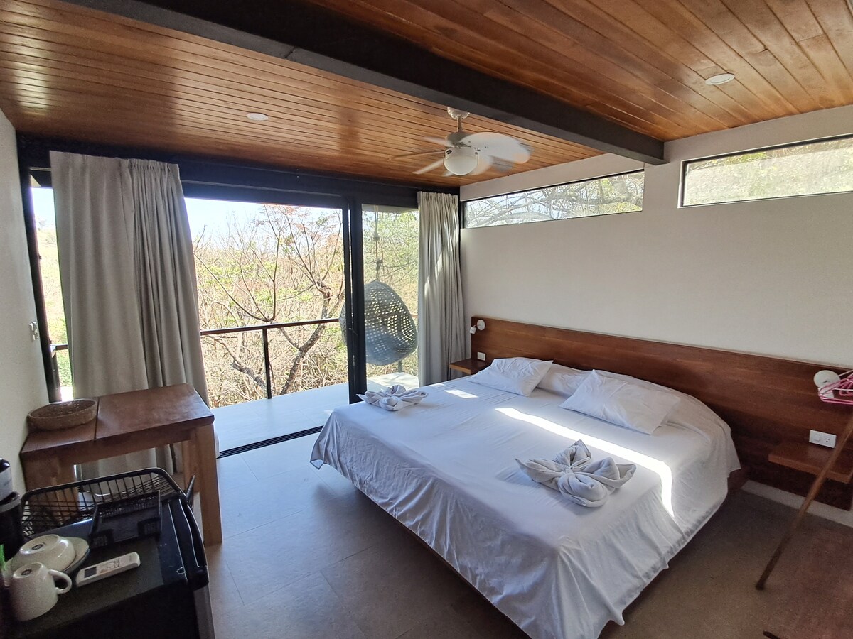 3 habitaciones con una cama queen, vista al mar, entorno natural seguro y relajado, cima de una colina,con vistas de 180 grados. Las habitaciones cuentan con A/C, mini bar, wi-fi, baño privado, desayuno incluido; también contamos con restaurante y piscina. La playa y el surf están a 5/10 minutos a pie.