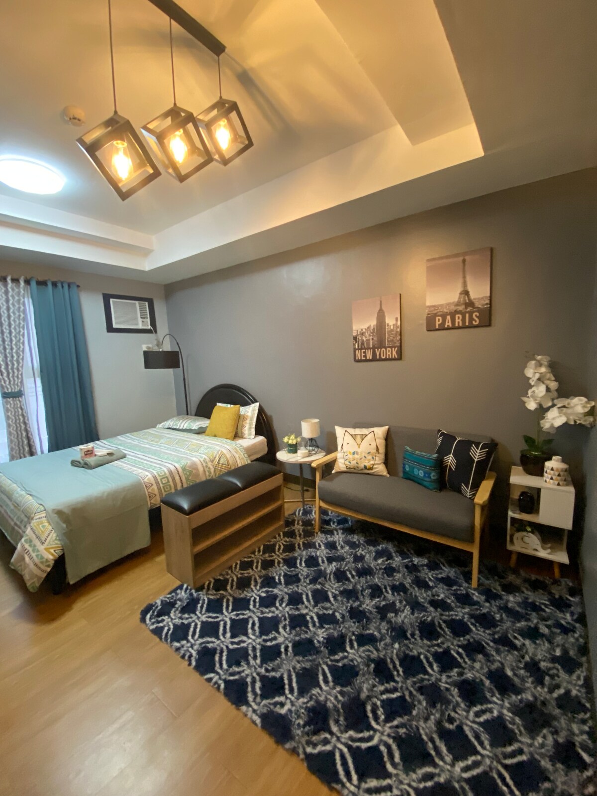 Rustic se encuentra en Valley Mansions Condominium, Cainta, Rizal. La unidad está diseñada con interiores de primera categoría y comodidades como wifi rápido, Netflix, barra de sonido, nevera grande de montaje inferior, cocina de inducción incorporada, horno multifuncional y ducha fría/caliente. Aunque se encuentra en el quinto piso (lo sentimos, no hay ascensor), la vista desde la unidad es espectacular, con vistas a Metro Manila en el oeste y las montañas de Antipolo al norte. También ofrecemos estacionamiento gratuito para tu comodidad.