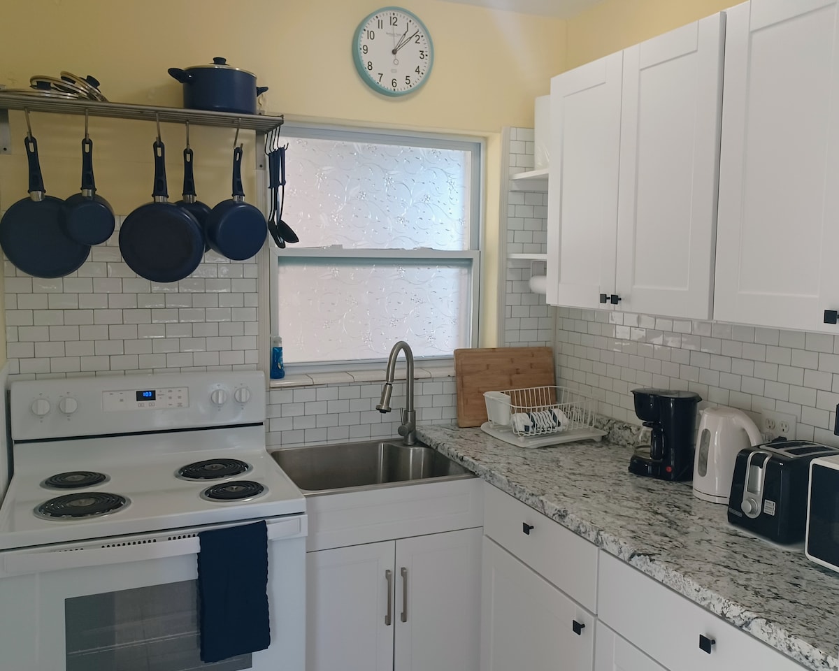 ¡Te damos la bienvenida a nuestro acogedor retiro en Bradenton! Perfecto para una pareja, este pequeño pero encantador espacio puede alojar cómodamente a nuestros huéspedes (idealmente una pareja y 2 niños pequeños si presionas para 4 huéspedes, ya que el sofá es pequeño, pero está fuera). Disfruta de la privacidad de tu propia zona de estacionamiento cerrado. Ubicado a solo 25-30 minutos de la hermosa playa Lido/Siesta Key y la isla Anna Maria, ¡puedes pasar tus días tomando el sol y explorando la vibrante escena local aquí!