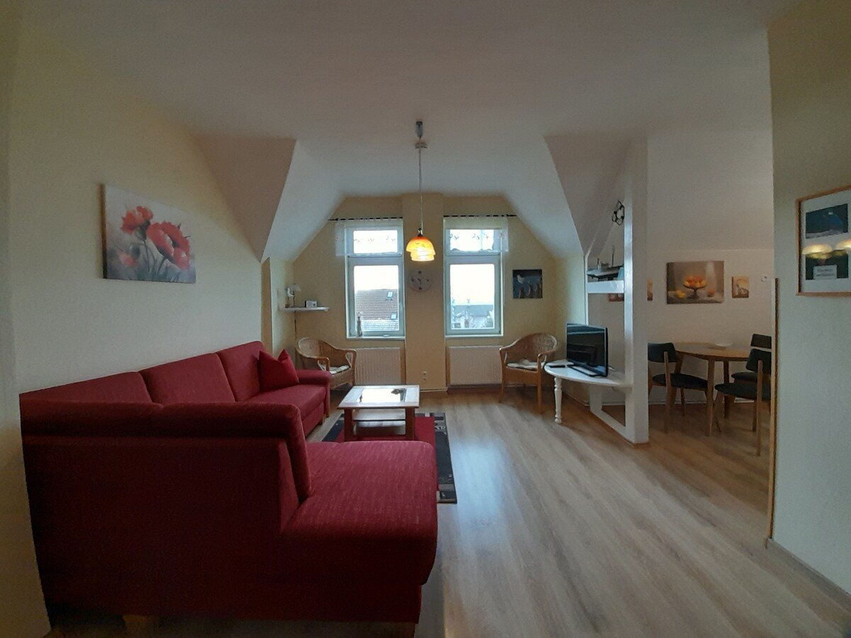 Este elegante apartamento de unos 50 m² se encuentra en el ático de una casa de dos familias en la ciudad portuaria de Sassnitz, un lugar encantador en la costa este de Rügen. Sassnitz se encuentra directamente en la famosa costa de tiza y ofrece un casco antiguo histórico, un puerto pesquero y la proximidad inmediata al Parque Nacional Jasmund, un punto de partida ideal para diversas exploraciones. Aquellos que viven aquí disfrutan de la ubicación tranquila y al mismo tiempo tienen muchos de los lados más hermosos de la isla cerca.